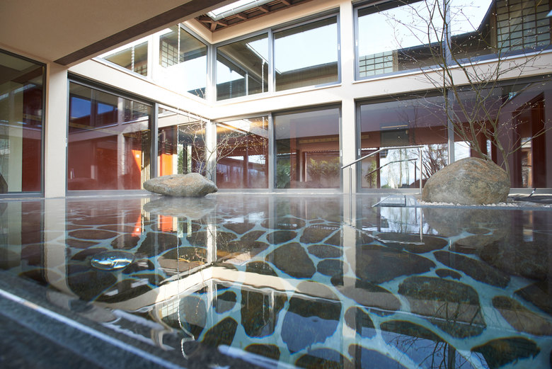 Klimaoffener Innenhof mit heissem Onsen Becken