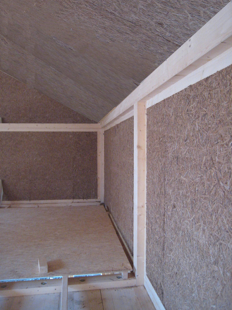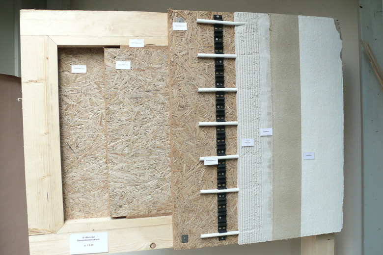 Außenwände, Innenwände und Dach werden mit Typhaplatten ausgefacht. Sie übernehmen im Wandaufbau sowohl die Dämmung als auch die Längsausssteifung der Wände und erfüllen vollständig alle schall- und brandschutztechnischen Anforderungen an die Wandbauteile. Aussenwände: Die 24cm starke Wandkonstruktion wurde mit 2 x 9 cm direkt verschraubten Typhaplatten fugenüberdeckt ausgefacht, zusätzlich wurde das Holzskelett aussenseitig mit einer 6cm Platte flächig überdeckt. Die Aussenwand erreicht so den geforderten U-Wert von 0,23. Die Tyhpawand wird aussen mit Kalkputz und innen mit Lehmputz abgeschlossen. So entsteht ein vollständig diffusionsoffener 1-schichtiger monomaterieller Wandaufbau. ( U-Wert = 0,23 ).