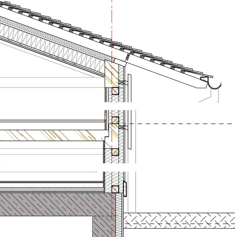 Dachkonstruktion: vorgefertigte Sparrentafeln wurden unterseitig mit Putzträgerplatten beplankt und oberseitig mit 6 cm Typhaplatten belegt. Die 18 cm tiefen Sparrengefache sind ausgeflockt. Die Dachkonstruktion erreicht so den geforderten U-Wert von 0,23. Das Dach wird aussen mit Lattung,Konterlattung und Lärchenspaltschindeln und innen mit Lehmputz abgeschlossen. ( U-Wert = 0,23 )