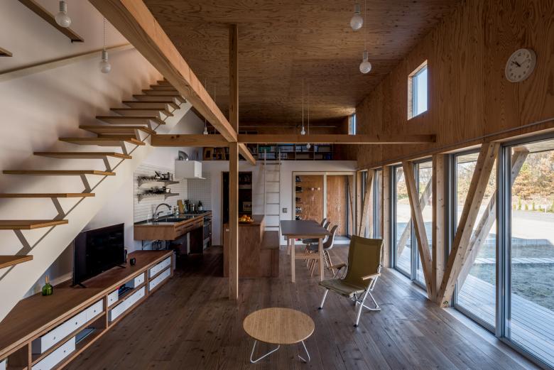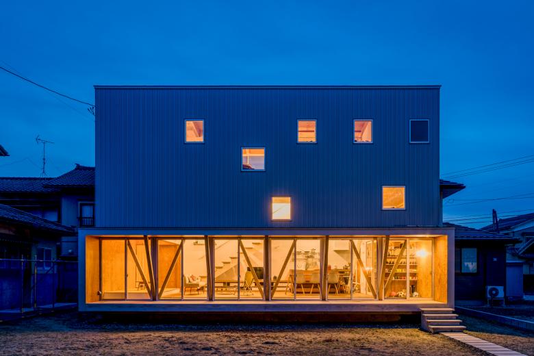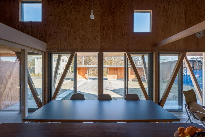 住居棟の屋外との境界には特徴的な筋交いの採用により全面開口と浮遊感のある縁側空間を実現。