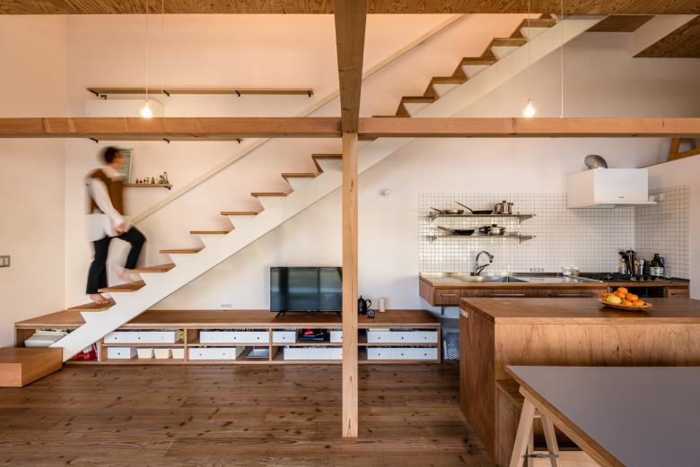 住居棟は木造二階建て、一階の階高を4.0mと高く確保し、それにより出来る大きな気積の中に、中間梁の上部空間をロフトも含む「間の階」として計画した。