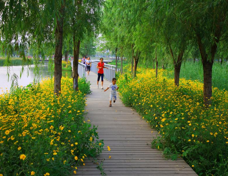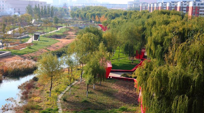 The Greenway can be characterized into three sections: the upper, the middle and the lower sections. The upper section runs through the city’s underdeveloped area and is featured with a newly created stream that diverts water from the Luan River integrated with pedestrian and cycling paths at both sides; The middle section runs through the densely populated communities and is most heavily used by people especially school kids, and the Folding Paper becomes the dominant feature. The concrete in the former river channel was removed, and the old channel was filled with the dirt from the excavation of the new river at the east side. In this way, the trees were saved and their roots on the steep old bank will not be exposed because of the removal of concrete; The lower section is in a less populated area and was most densely forested area, with pre-existing wetlands, where it is more featured with multiple stream courses, tree islands, wetlands and boardwalk networks which run across islands and cycling paths at both sides of the Greenway.
