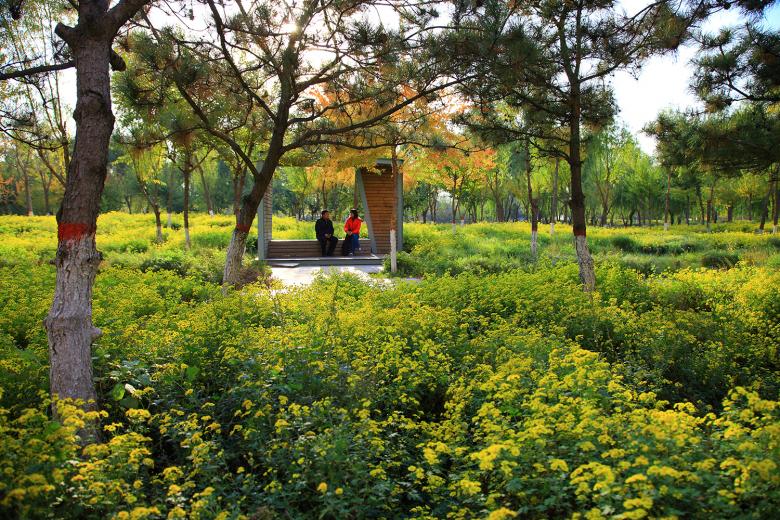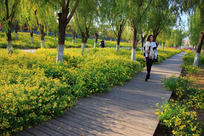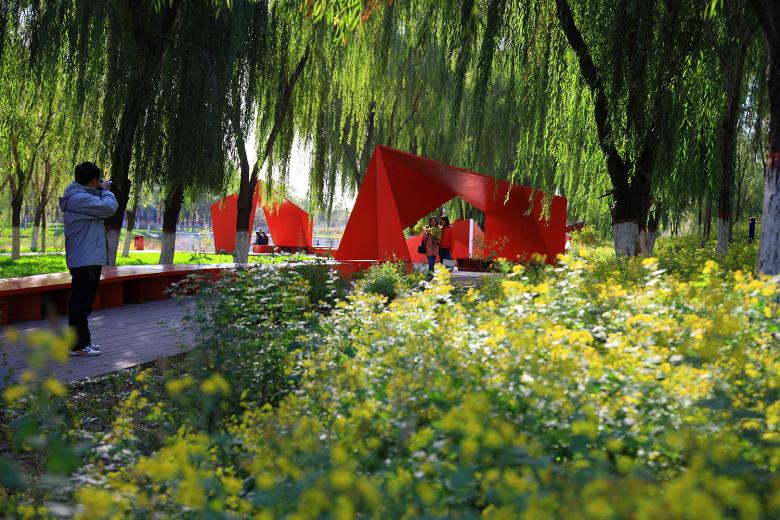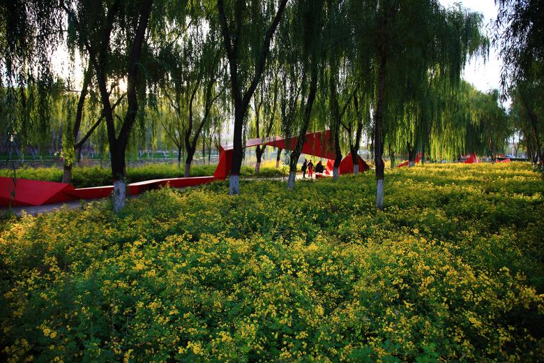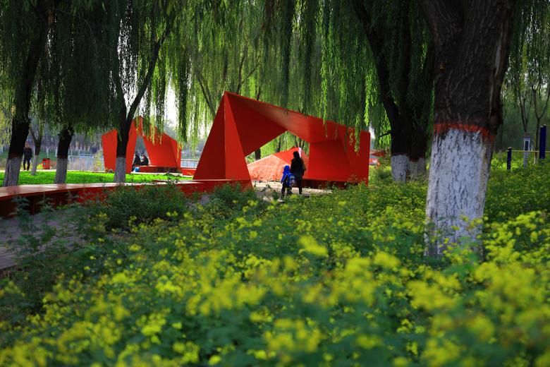 (7) Integration of art: Art is integrated with the ecologically recovered landscape. One of the major pieces is an 800-meter long Folding Paper made of fiber glass and in Chinese red, which integrates shelters, seats, boardwalk and lighting. The Folding Paper is inspired by the well-known local folk art of paper cutting. Sitting right on the school route between a densely populated community and city’s major elementary schools and kindergartens, this red-colored installation runs through the green canopy of the pre-existing willows, enriches the landscape with planting of “messy” Chinese pennisetum and wild chrysanthemum, and becomes an artful and unforgettable daily experience for kids and their parents.