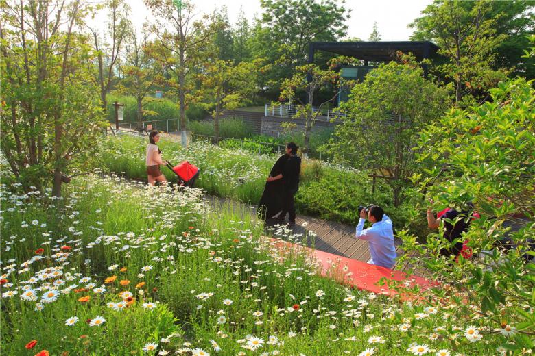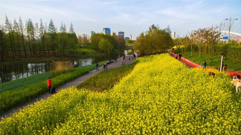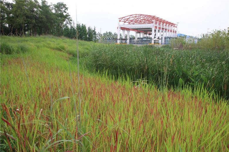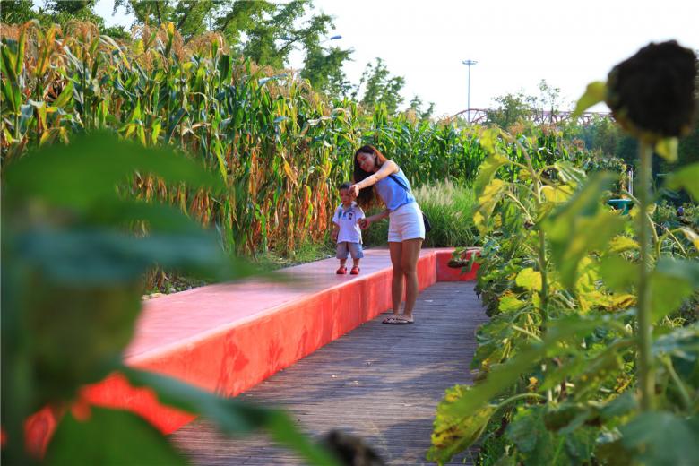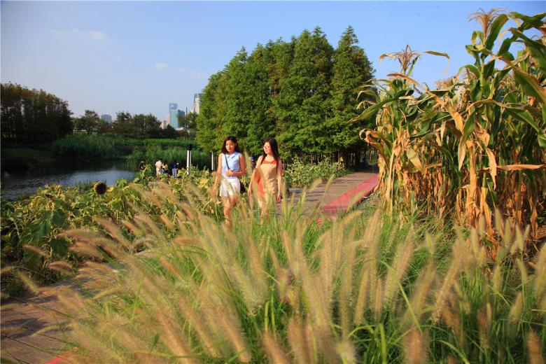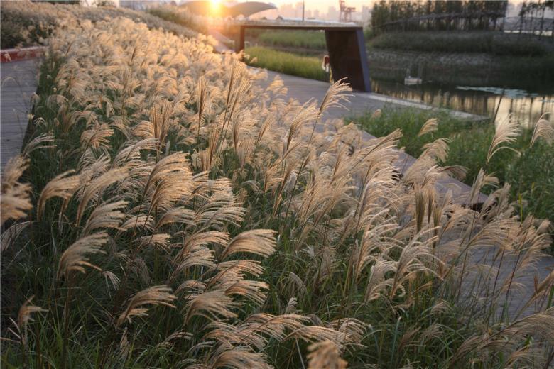 Inspired by the fields of Chinese agricultural landscape, terraces were created to break down the 3-5 meter (15-18 foot) elevation change from the water’s edge to the road, and to slow the runoff directed to the stream in the constructed wetland. These terraces are reminiscent of Shanghai’s agricultural heritage prior to industrial development of the neighborhood in the mid 20th century. Crops and wetland plants were selected to create an urban farm allowing people to witness seasonal changes: the golden blossoms in the spring, splendid sunflowers in the summer, fragrance of the ripened rice in the fall, and green clover in the winter. It provides a premier educational opportunity for people to learn about agriculture and farming within the city.