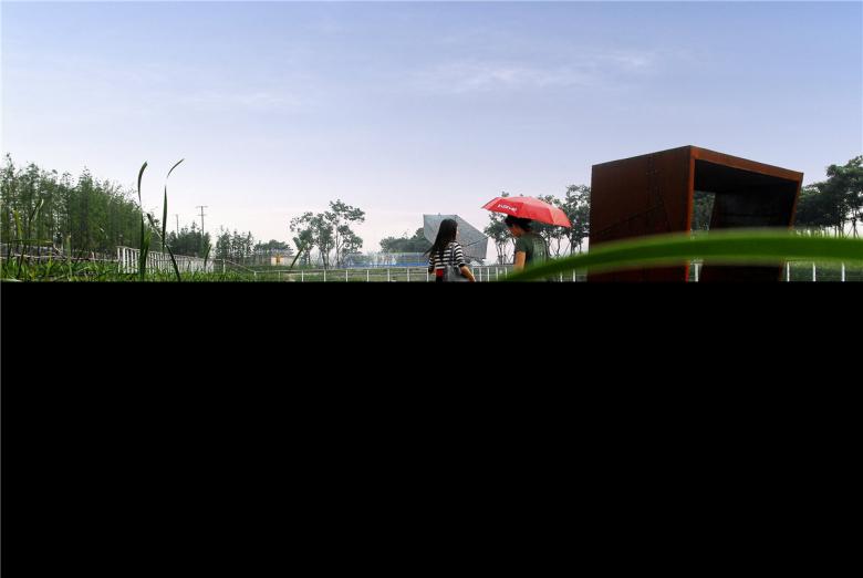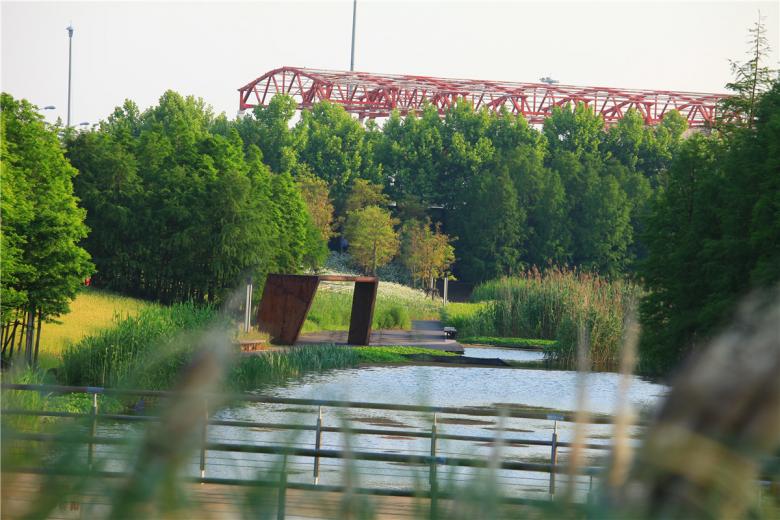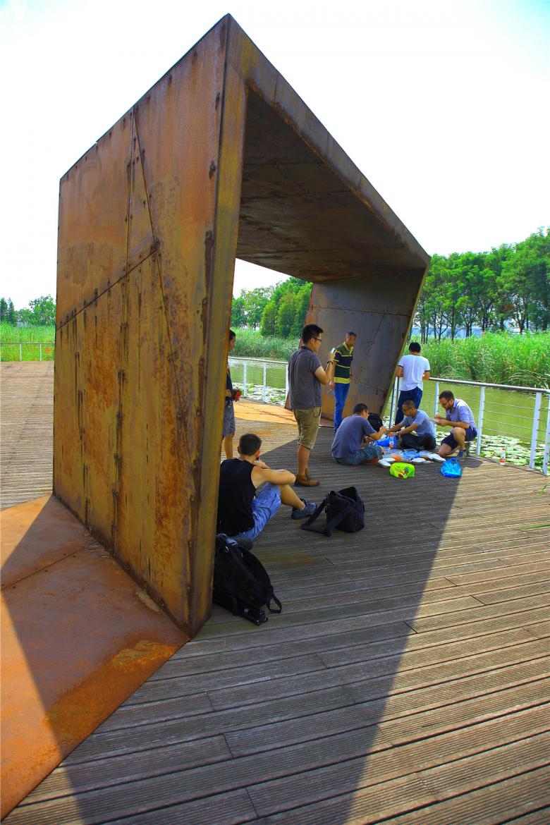 The reclaimed steel panels hail the site’s former industrial spirit. Situated throughout the wetland valley, the folded steel panels are used to frame views of Shanghai’s skyline and highlight the industrial past. The materials are reconfigured to create artful forms, new paving material for the boardwalk, and shelters.