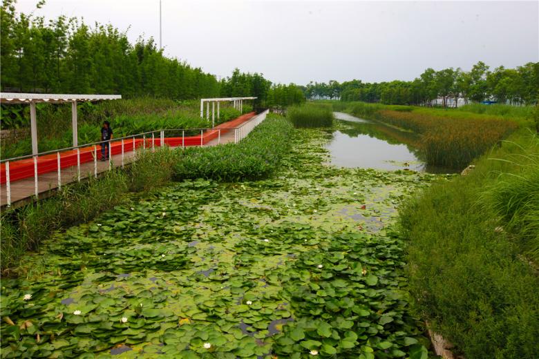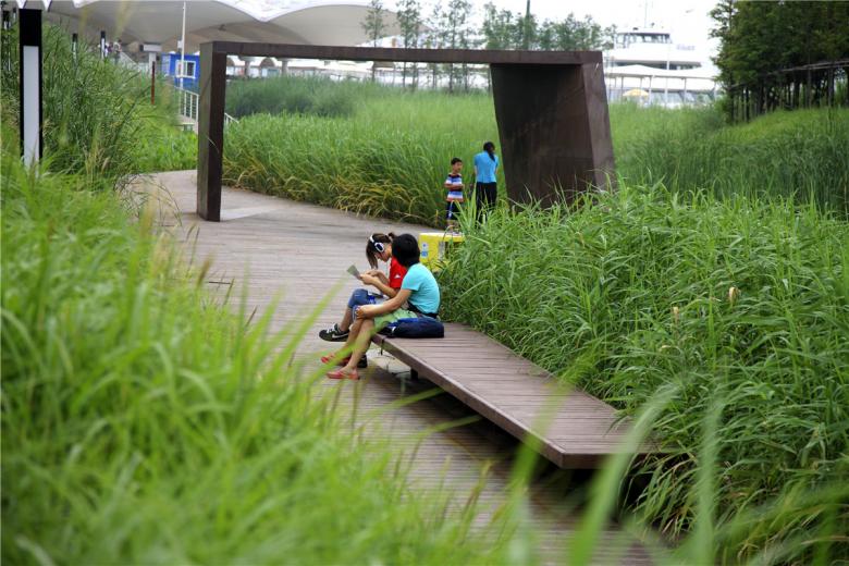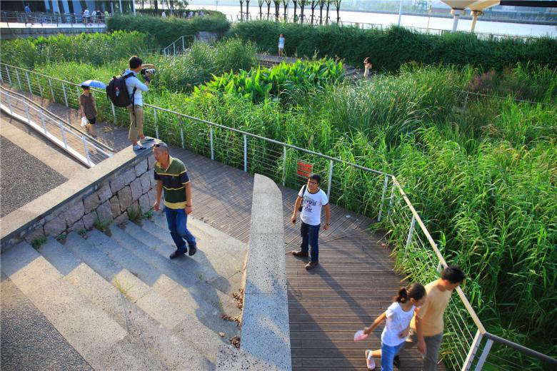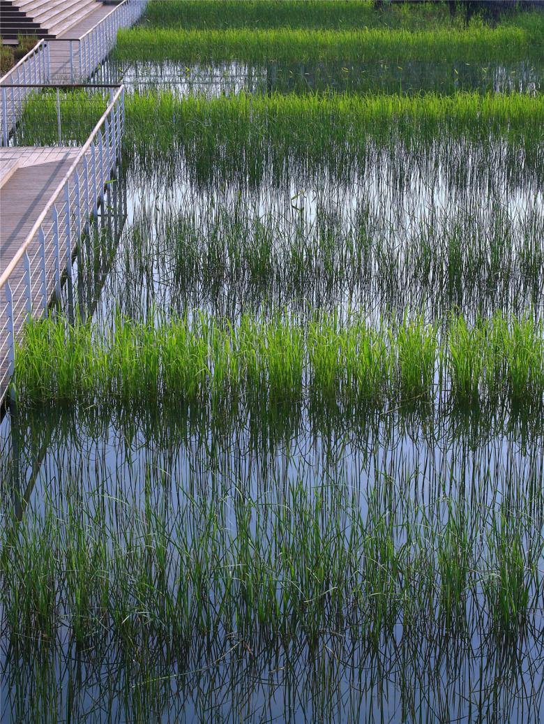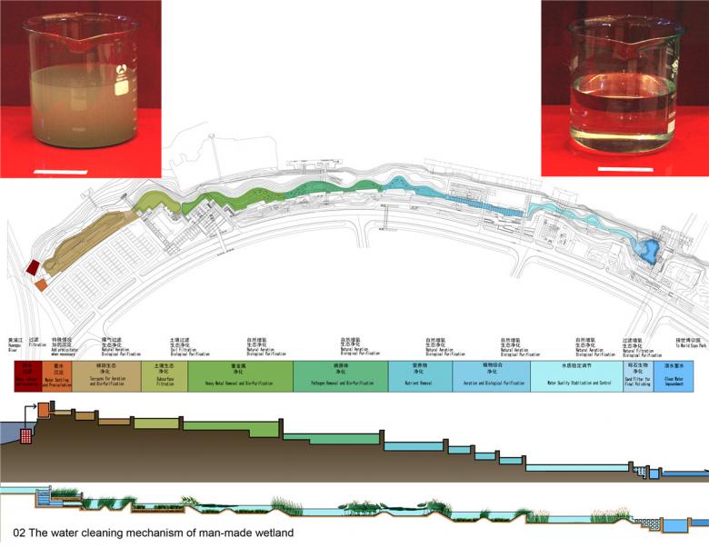 Through the center of the park, a linear constructed wetland, 1.7 kilometers (one mile) long and 5- 30 meters (16.5 – 100 feet) wide was designed to create a reinvigorated waterfront as a living machine to treat contaminated water from the Huangpu River. Cascades and terraces are used to oxygenate the nutrient rich water, remove and retain nutrients and reduce suspended sediments while creating pleasant water features; Different species of wetland plants were selected and designed to absorb different pollutants from the water. Field testing indicates that 2,400 cubic meters (500,000 gallons) per day of water can be treated from Lower Grade V to Grade III. The treated water can be used safely throughout the Expo for non-potable uses, and save half a million US dollars in comparison with conventional water treatment.