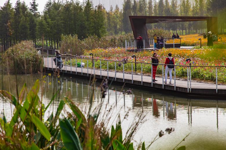 On the terraces between the wetlands and arbor belts, annual crops and flowers are planted in season, including canola in spring, sunflower in summer and chrysanthemums in autumn. The changing plants bring a seasonal rhythm and sense of change to the city, providing the new generation of urban residents with a chance to reconnect with farming and nature. In contrast with other cities built on stereotyped plans, the urban area in Ningbo Eastern New Town has been refreshed by a pleasant vitality.