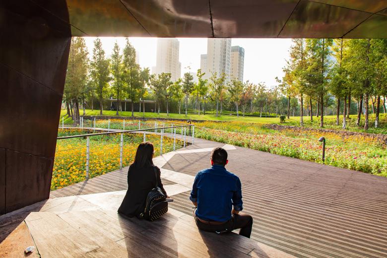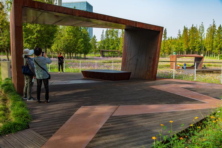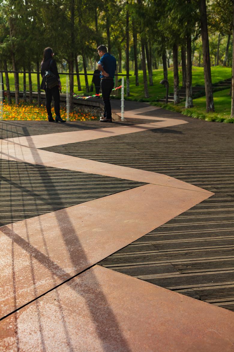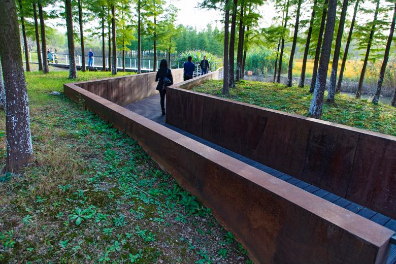 Continuous footpaths and cycling paths run through the ecological corridor and connect with the city’s broader greenway system. A boardwalk system, connecting the city and going through the wetland, groves and terraces, provides various opportunities for immersive experiences. Several wooden platforms are embedded in the wetlands and terraces, or interspersed with trees. The platforms are also combined with pavilions, embellished on the landscape matrix. The pavilions are made of folded corten steel. They are both art installations and shelters, inviting people to relax and linger. They have become the visual highlight of the ecological corridor.