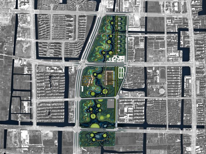 The Sponge Greenway was built upon a typical post-industrial site with degraded ecological function that was slated to become part of a new urbanized district. The holistic, ecosystem services-oriented project introduced terraced wetlands to slow the flow of urban runoff and remove pollutants. The original channelized river was transformed into a meandering, ecologically functional waterway dotted with tree-covered islands to increase the interface between organisms and the water bodies, in order to boost the river’s natural purification capacity. Crops and flowers are rotated to create a sense of seasonal surprise and agricultural vitality within the growing city. The project’s boardwalks are designed to bring visitors closer to the natural landscape. Pavilions made of corten steel float on the wetlands and terraces, lending a touch of contemporary style to the ecological corridor. This project demonstrated that an engineered landscape, as a kind of ecological infrastructure, can heal the degraded ecological system while providing social and cultural services to the neighboring communities.