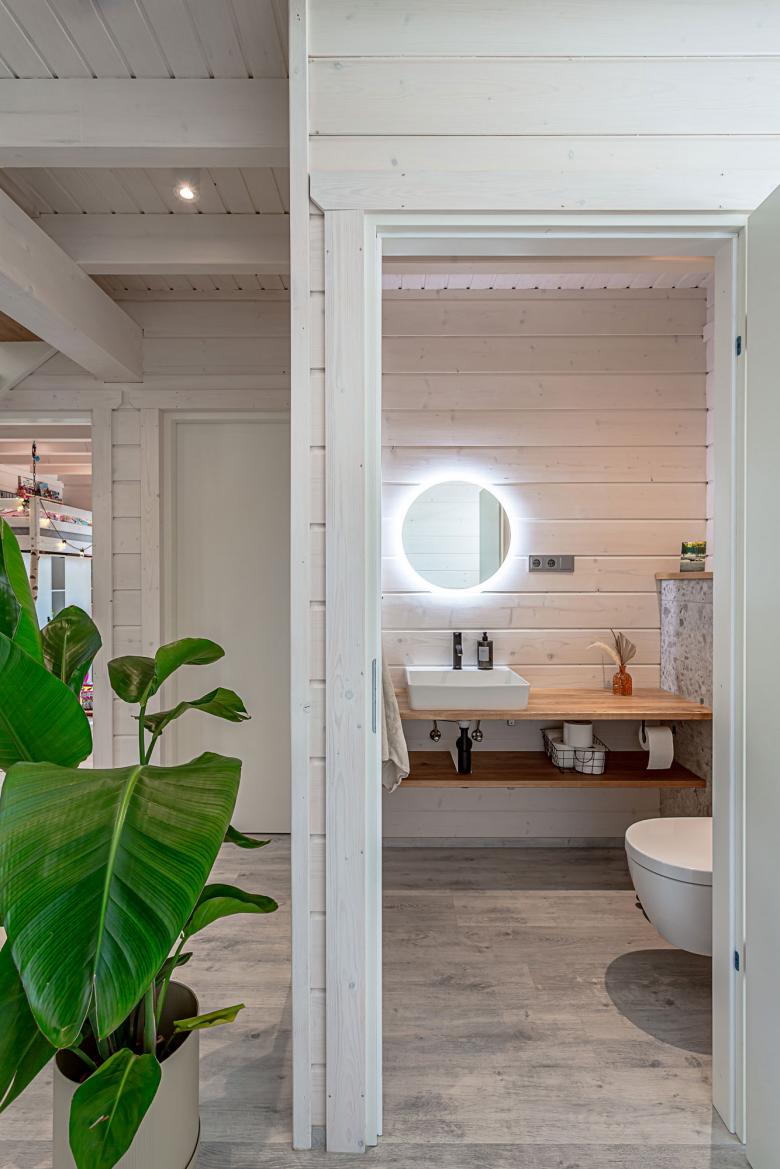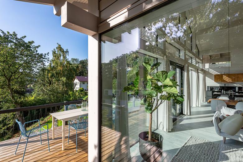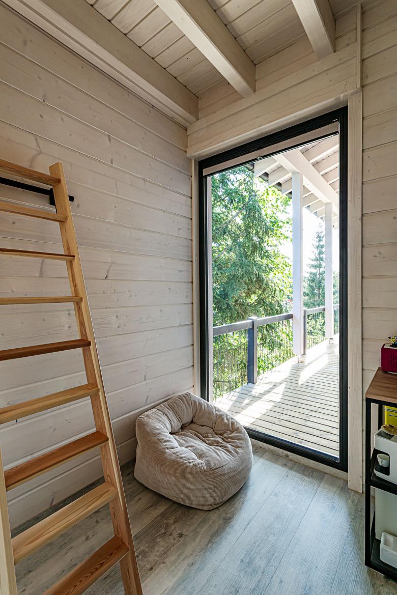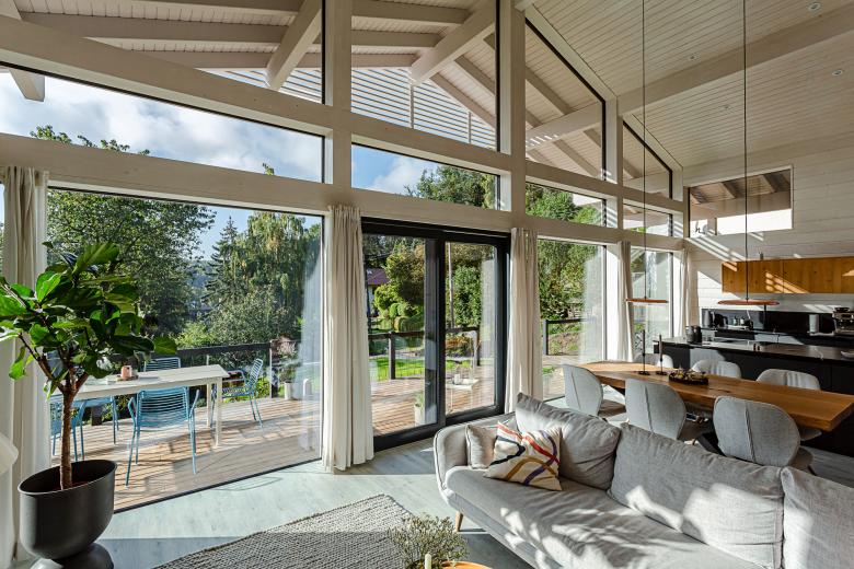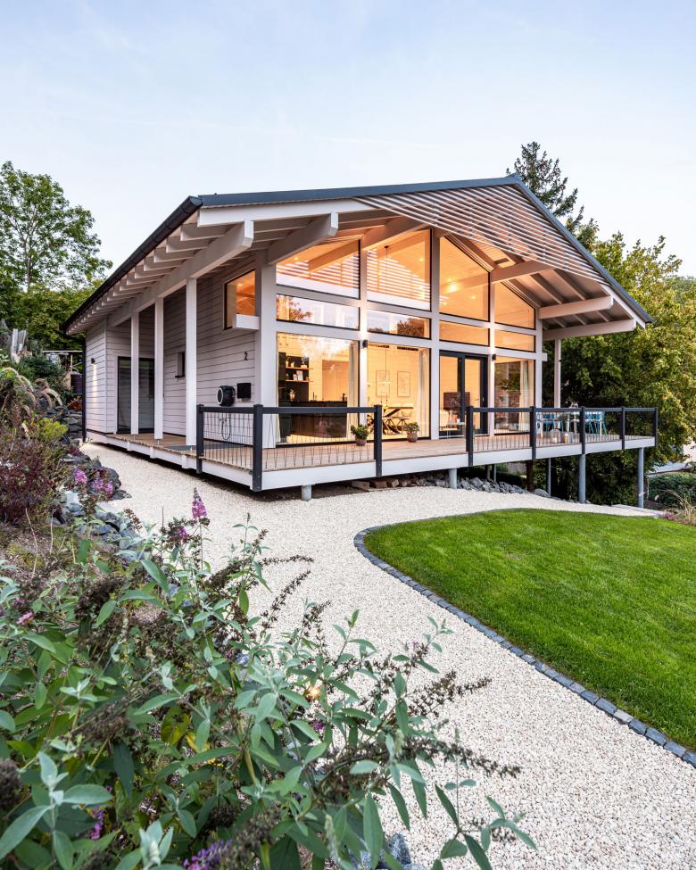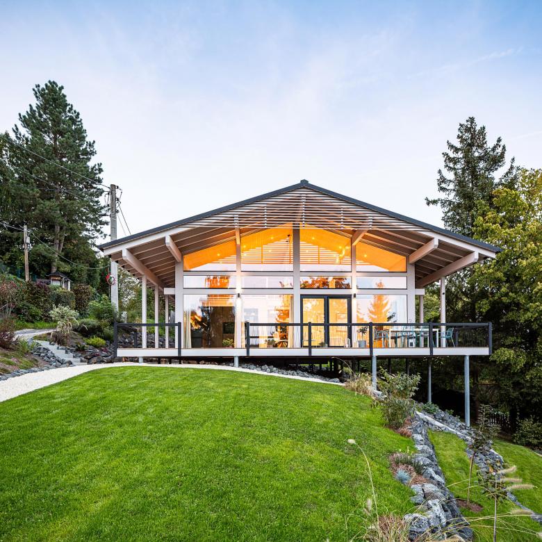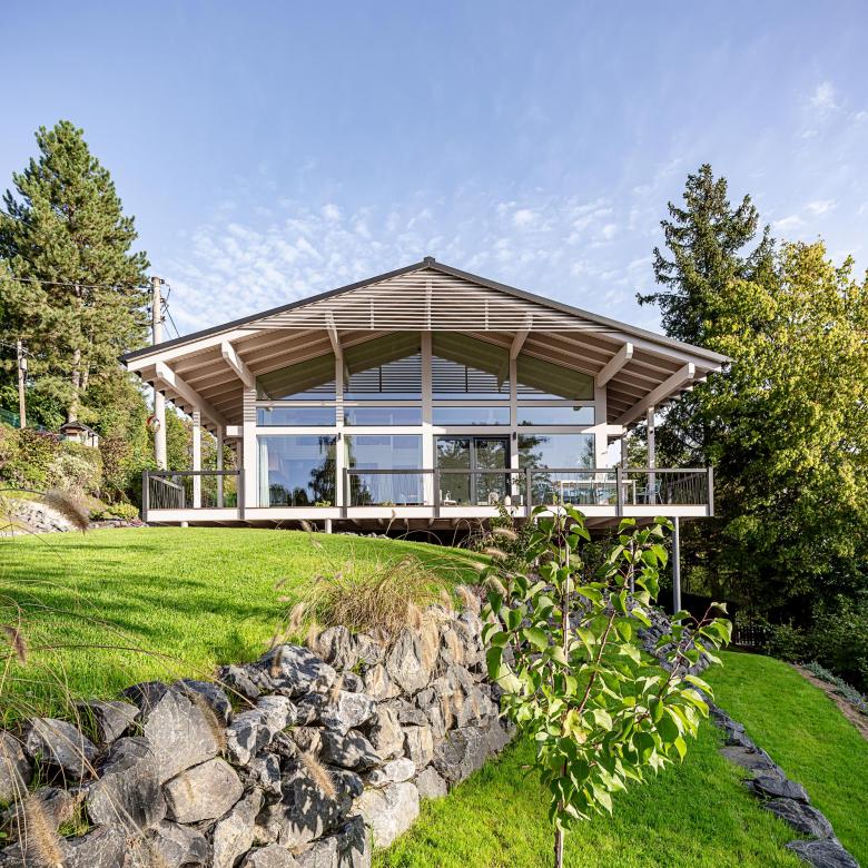 Nachhaltiges Einfamilienhaus aus Holz von Polar Life Haus aus Finnland, das an einem steilen Hang auf Stelzen gebaut wurde, um die Konstruktion zu stützen.