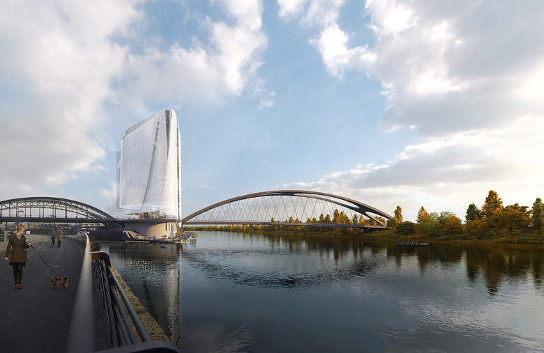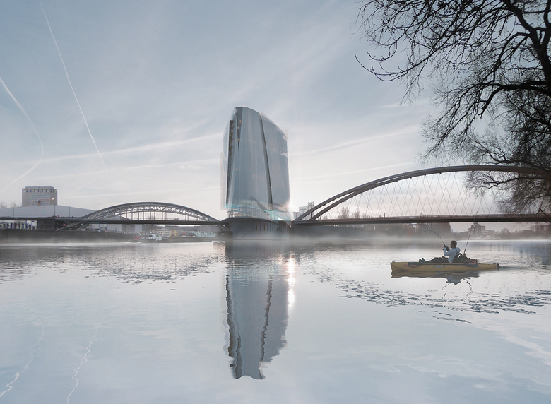 The Hafenpark Quartier Hotel is located at the junction of Honsellbrüke and Osthafenbrüke; the Main is divided into different canals, with two open-armed bridges marking the convergence. The point of support of the two bridges on the strip of land in the centre is the site of the project, like an island; this location makes it both a marker in the urban fabric of the City of Frankfurt and a call for a unique architecture.