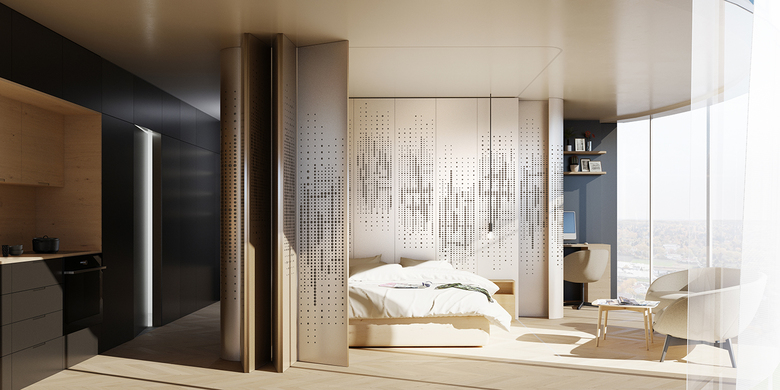 This lobby is designed to allow two separate access points: one to the hotel and the other to the boarding house. An atrium and a plaza create an open space between the two 12 floor programmes that dialogue with the city.