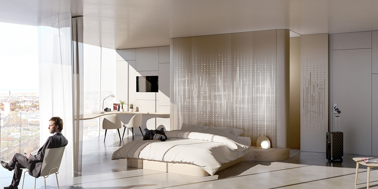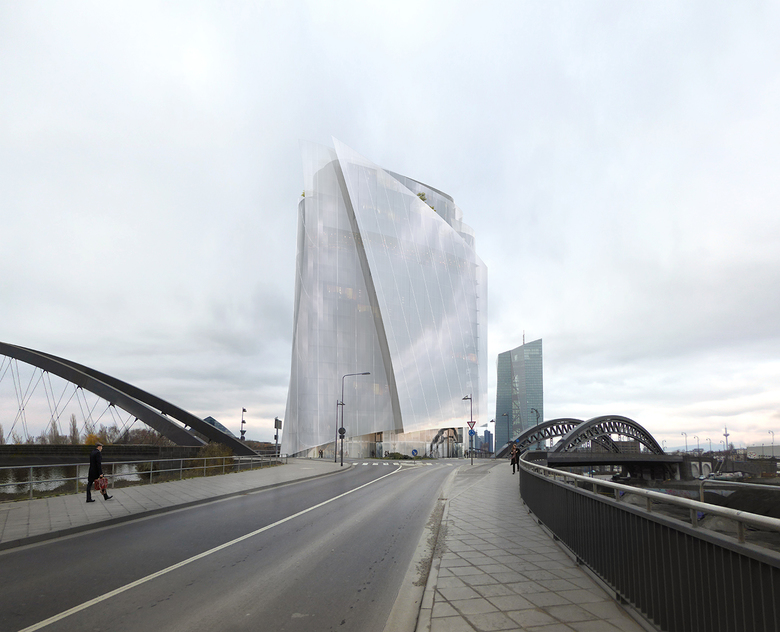 The play of light on the glass surface reflects the sky and city, and absorbs it. The life of the city flows into the building, every surface is a window, everything is structural, there is no longer any definition, it is one whole. On all levels, each room has a bay window allowing natural ventilation and offering travellers an exceptional view of the Main and the city of Frankfurt.