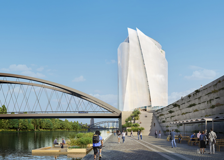 This confluence reflects the urban challenge of linking the two banks of the Main. At an architectural scale, this synergy gives rise, in the lower part, to a pedestal designed by water erosion, in dialogue with the Main. It is crowned by a platform: a hand stretched out towards the city from which rises an ethereal form, sculpted by light.