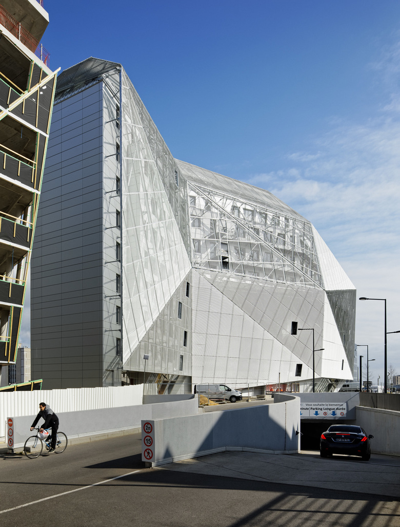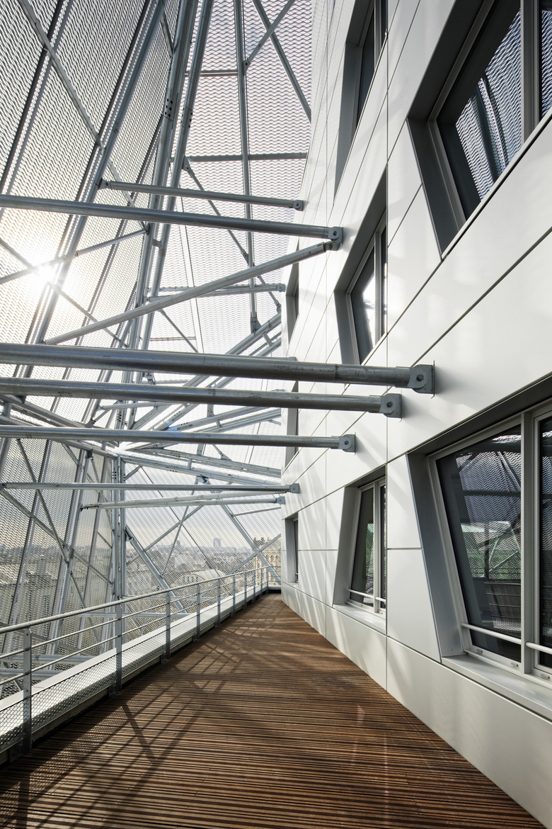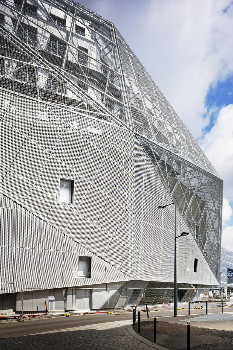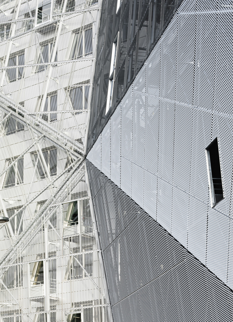 Identity One’s double skin is one of the key elements of the project. The roughness of the metal exoskeleton creates a contrast with the smooth façade underneath. The blades constituting this metal net are arranged following a double-stripe pattern. The superior stripe is larger than the inferior one so as to protect the offices on the higher floors from the sunrays while still letting in as much natural light as possible. Identity One seems to float over the railroad as a metal volume of which the density of the facets varies.