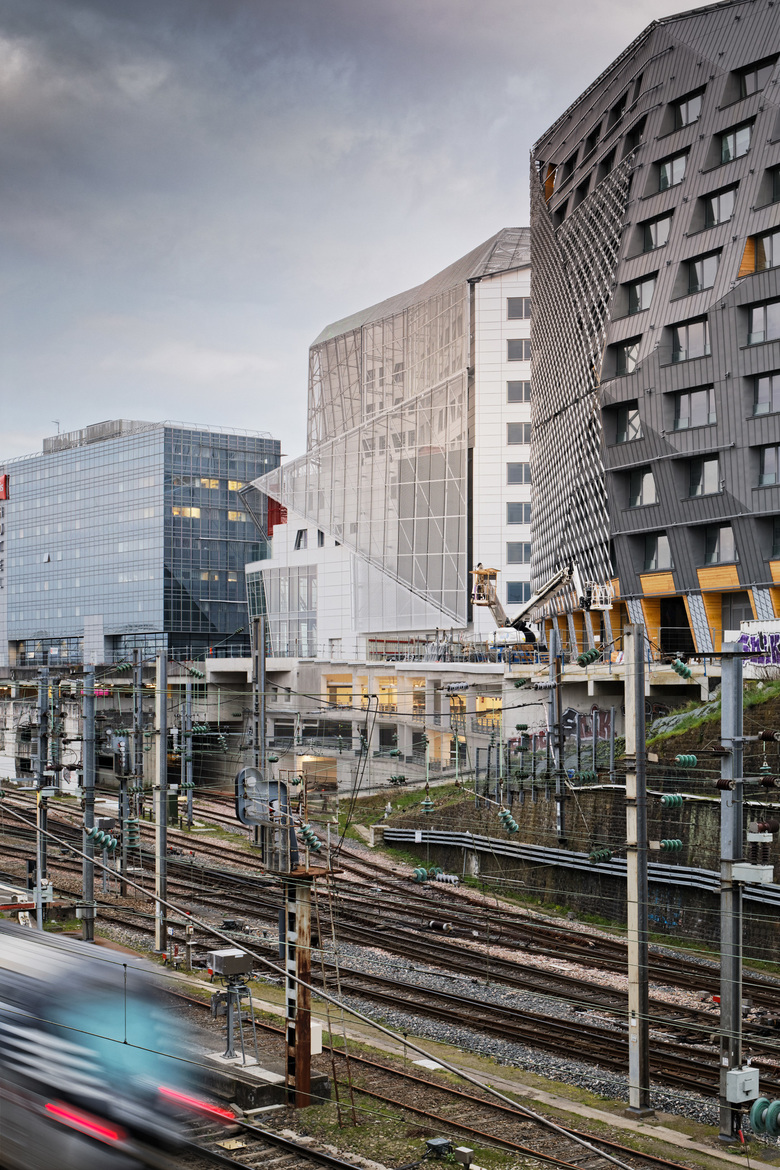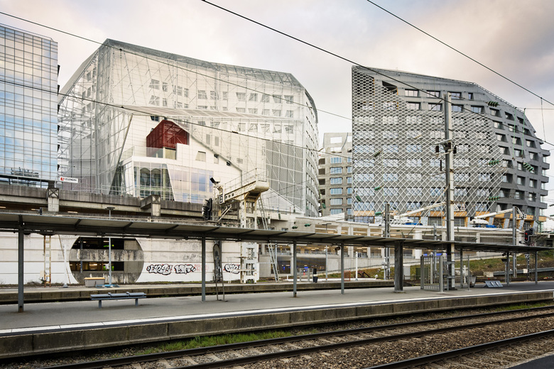 As a part of this urban development that includes the transformation of the multimodal hub around the train station, a group of three buildings known as “Identity” emerges on top of the railroad on the Feval block. Jean-Paul Viguier et Associés signs the architecture of one of the buildings, Identity One, and is in charge of the project coordination for the entire area. The architecture firms Architecture Blanchard Marsault Pondevie and Maurer et Gilbert Architectes have respectively designed Identity Two and Three.