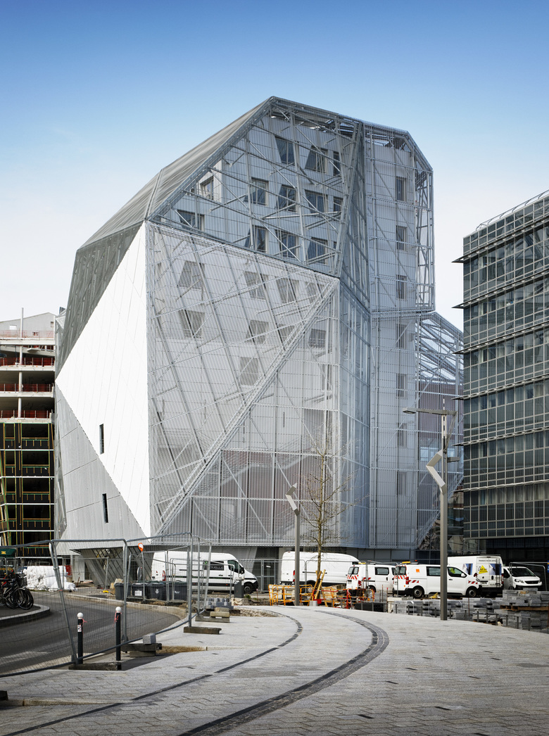 The Identity cluster is a geode split up into three buildings presenting angular facades and singular designs. As a unifying element, a double skin in anodised aluminum clads the façade and gives a unique identity to each of the buildings.