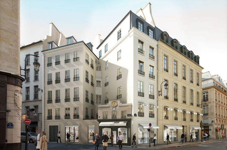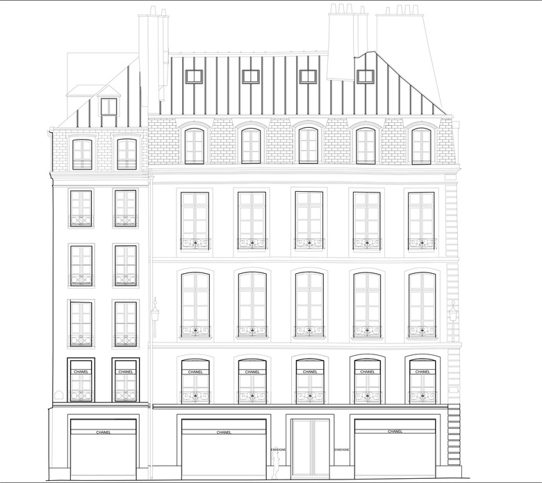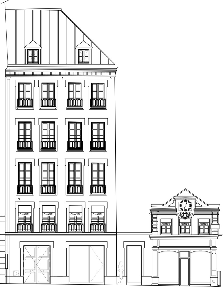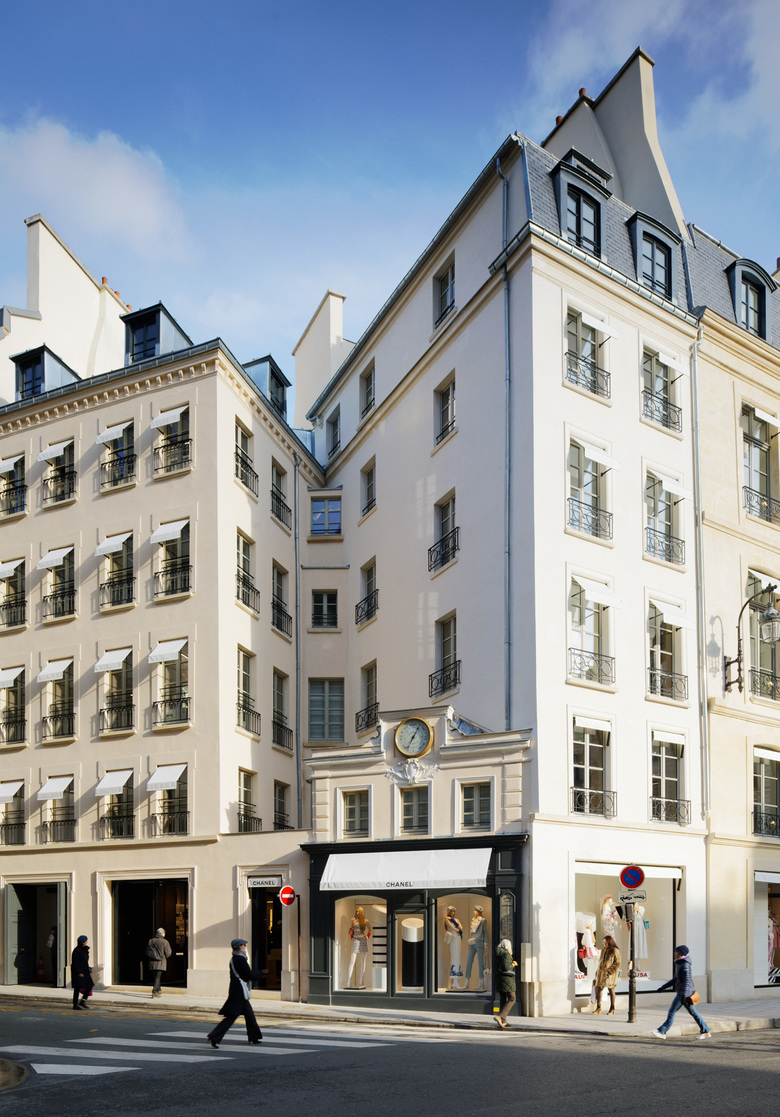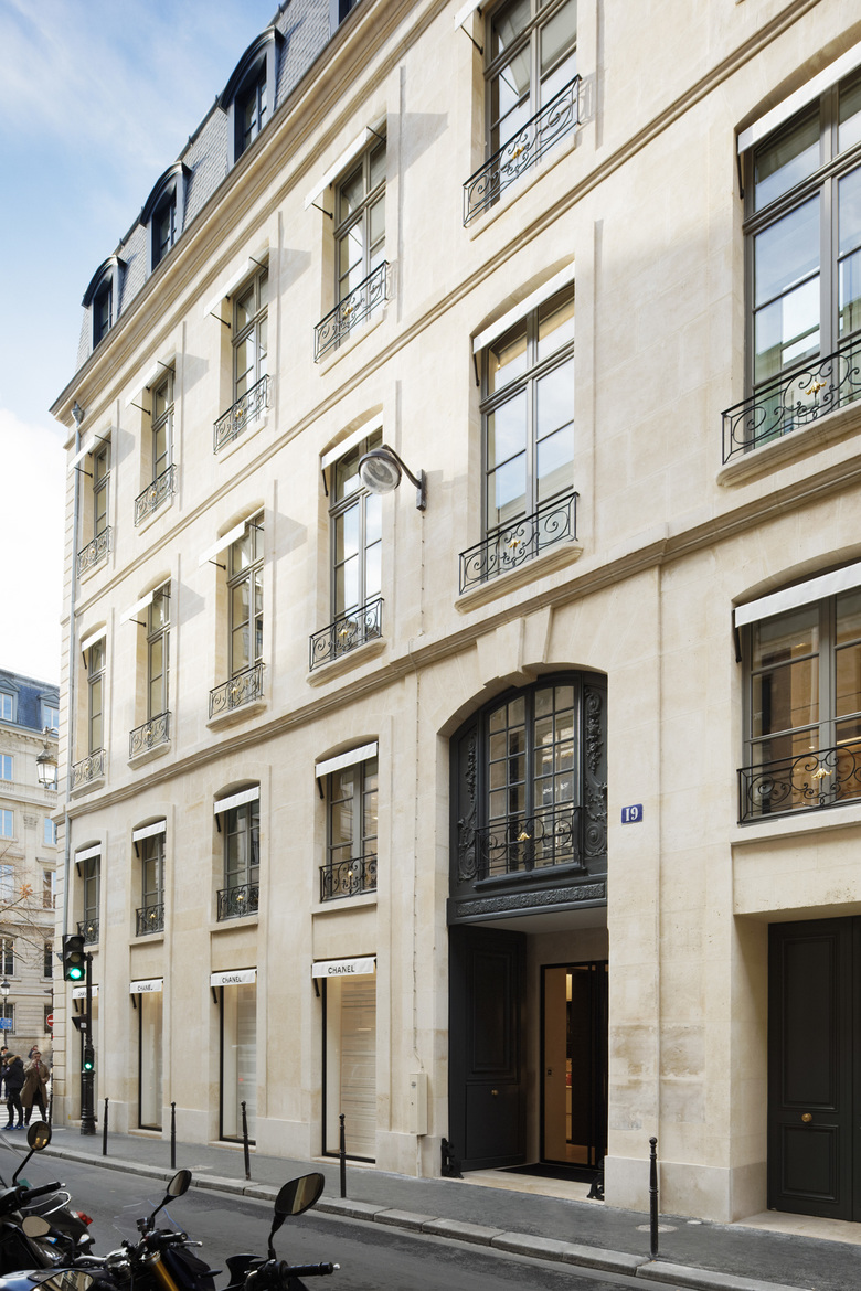 Part of the mandate was to reveal the historical stylistic pattern connecting the Rue Cambon, the Rue Saint-Honoré and the Rue Duphot. It results in the restitution of the original design of the facade from which the balustrades and the elegant porch on rue Cambon stand out. On the ground floor, the new store fronts are harmonized with the different stone shades which mark the respective dates of construction of the three buildings.