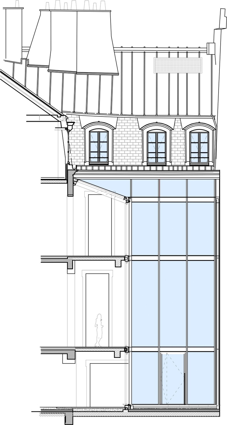 On the other side of the building, the 19th century glass wall has been remodelled so as to give it a contemporary character. The natural light coming through this 3-level monumental window gives shape to the interior.