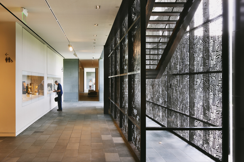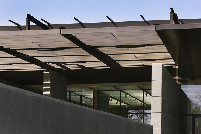 An ingenious roofing device with a thickness of approximately 2.20 meters has been developed for this specific project. A machine that treats light enacting as a cover composed of several layers that at times breaks, diffuses and regulates by means of motorized horizontal blinds the vibrant burning light of southern Texas. It also controls its intensity and direction. The roof is cantilevered along the facade and thus, protects the exhibition galleries from direct sunlight.