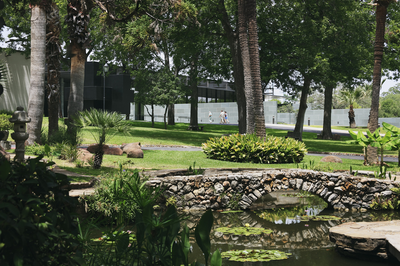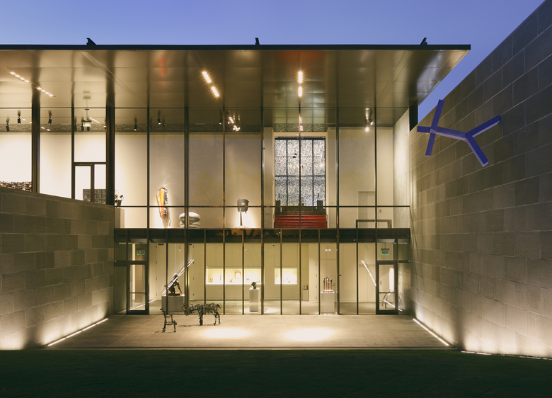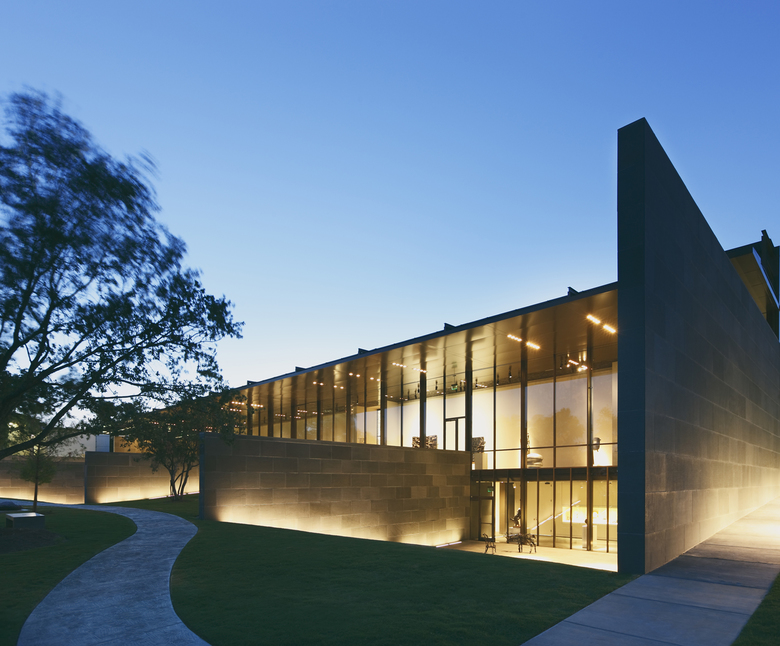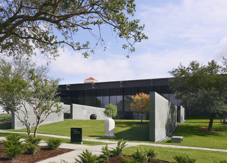 The extension of the McNay Museum of Modern Art, otherwise known as the Jane and Arthur Stieren Exhibition Center, is a long volume glass on two levels embedded within a vegetal slope