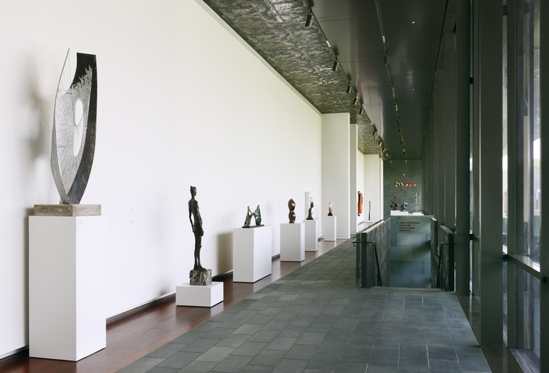 At the highest level, the glass-faced façade offers a view overlooking the undulating sculpture gardens and opens up onto an outdoor terrace. At the lowest level, the glazed façade plays hide-and-seek with the outdoor spaces. In essence, disappearing behind paved terraces and reappearing again towards the sculpture gardens to then ever fade again behind the planted slope. In the garden of the sculptures, the alignments of stone walls are punctuated by the fabric of the building and define the three outer galleries extending the atmospheric experience of the interior space to the exterior