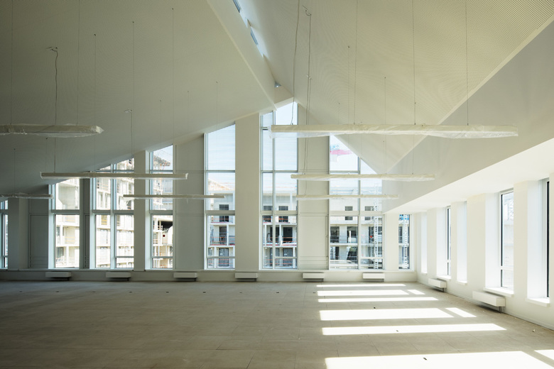 These office spaces rise up to the 7th level of the building. On the ground floor level, the glazed double-height lobby seems to be moving towards the sidewalk. The various businesses present on the site connect the building to the street and its passersby, its movement and its energy. On the first floor, a company cafeteria extended by vegetalized balconies will serve up to 1.050 meals per day. On the 7th floor, the pleated roofs create meeting spaces extented by 300m² of terraces offering a panoramic view on the city from the south side, and on the park from the north side.