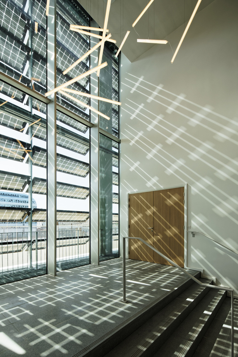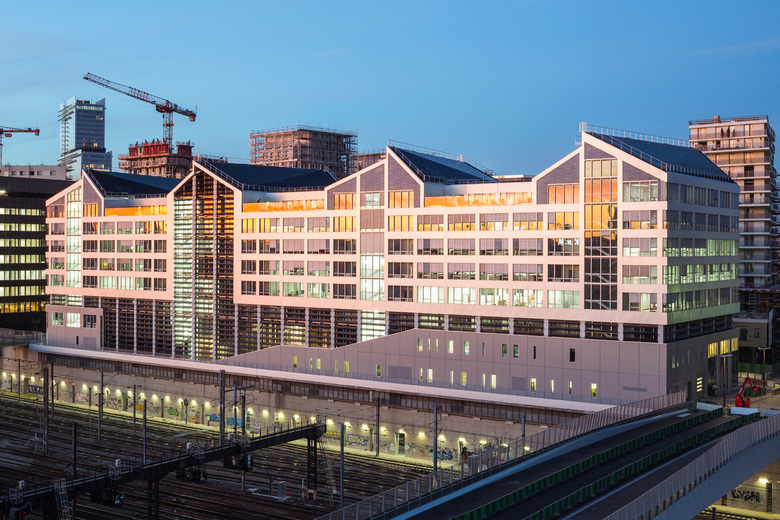 Sitting on the railway slab ten meters above the soil, the building is entirely detached from the ground, as if it were levitating. From the sides, Seasons appears as a 16-meter wide long body of double-orientation offices. The west façade borders the SNCF railway coming out of Saint-Lazare station and constitutes a shield against the noise pollution produced by rail traffic. Borderd by a bridge on the one side and by a pedestrian bridge on the othe, the operation is the sign of a new entrance way for the Clichy-Batignolles area.