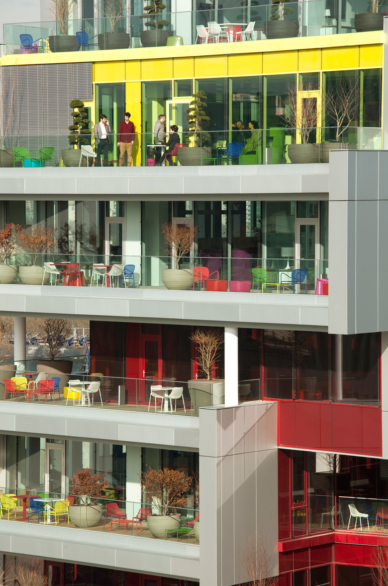 Facing south, a system of horizontal partitions protect the employee from the sun. The stairways have been placed facing the gardens so as to allow for a constat visuel contact with the redesigned landscape. Shared spaces are found on the ground floor of the building including several restaurants, a gym, and relaxtion areas.