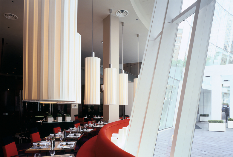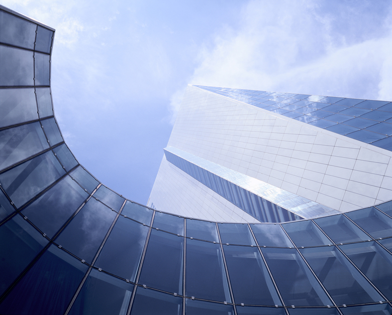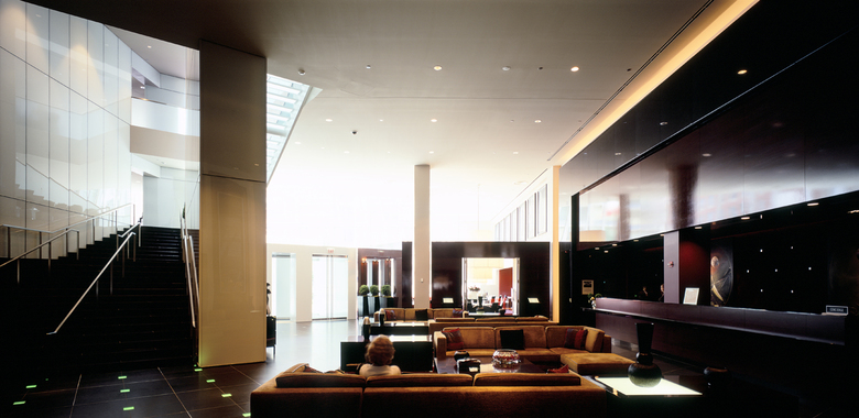 The prow leans out over the street, affording spectacular views from the rooms and, as a small architectural gesture, creating an iconic presence in the city. This presence is reinforced by the facades, whose alternating strips of clear or white screen-printed glass bring a splash of light to the darker surroundings. The base plate and prism facades facing the elliptical plaza are glazed to their full height with clear glass highlighting the point where the virtual cone “cuts” into the prism.