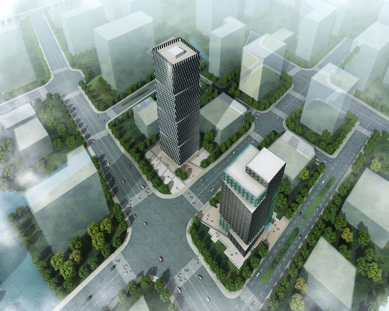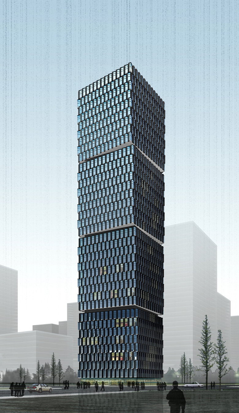 The façade of this office building encompasses pre-cast concrete integrated with windows dislocated in one module. This creates a shadow effect which alternates according to the sky light.
