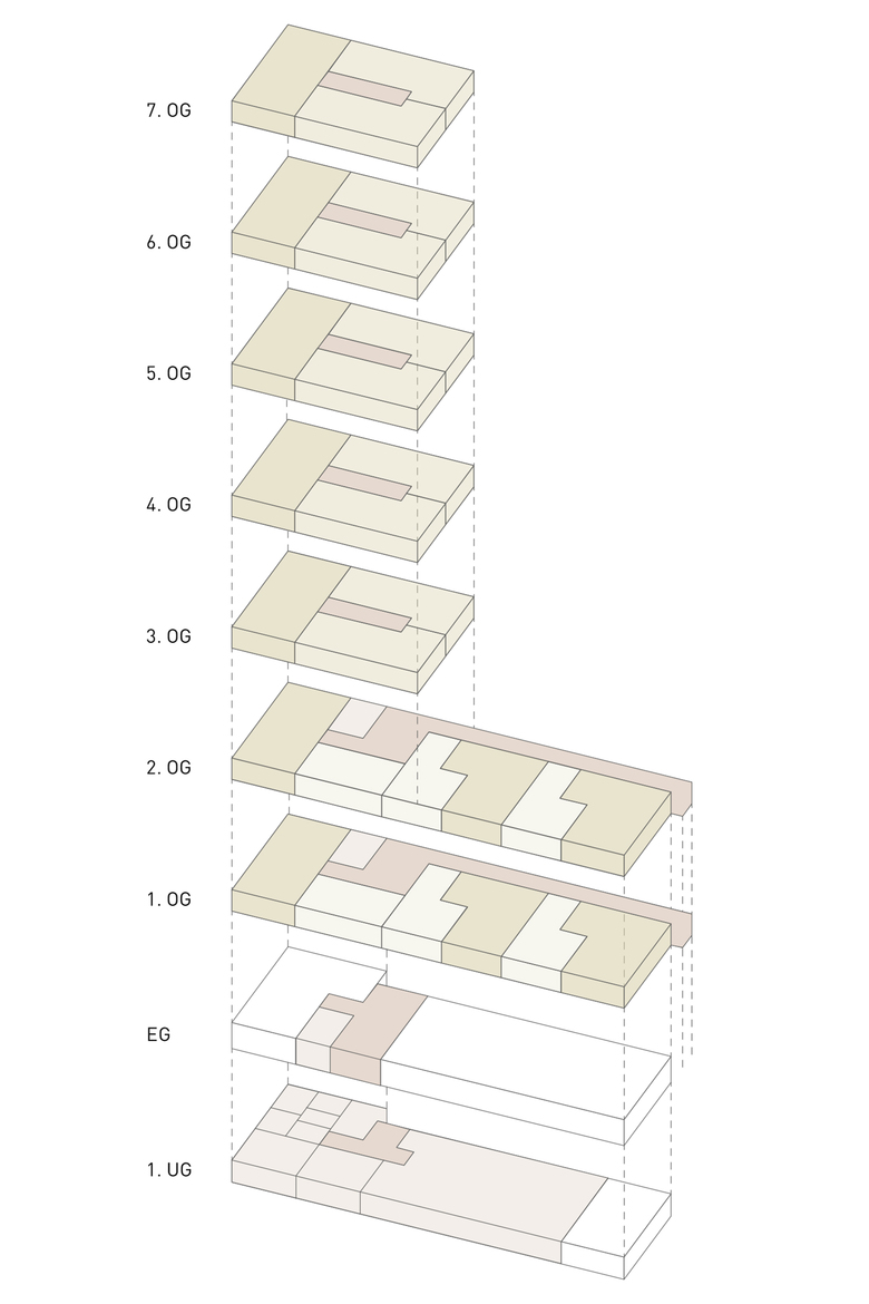 Sämtliche Wohnungen sind über einen einzigen, grosszügigen Eingang erschlossen. Adresse und Haupteingang liegen auf der Westseite, ein Zu- und Ausgang auf der Ostseite ermöglicht die Durchlässigkeit zu den beiden Längsseiten. Die Wohnungserschliessung ist ein hybrid aus Laubengang und Punkterschliessung. Das Treppenhaus ist in den ersten drei Geschossen ein lebendiger Raum und reduziert sich ab dem vierten Geschoss zu einer effizienten Punkterschliessung. Die Reduktion auf eine gemeinsame Erschliessung für die 27 Wohnungen fördert die Begegnung und die Kommunikation untereinander. Die zwei Erschliessungstypen erzeugen zudem unterschiedliche Wohnungstypen, was die Vielfalt der Wohnungen fördert.