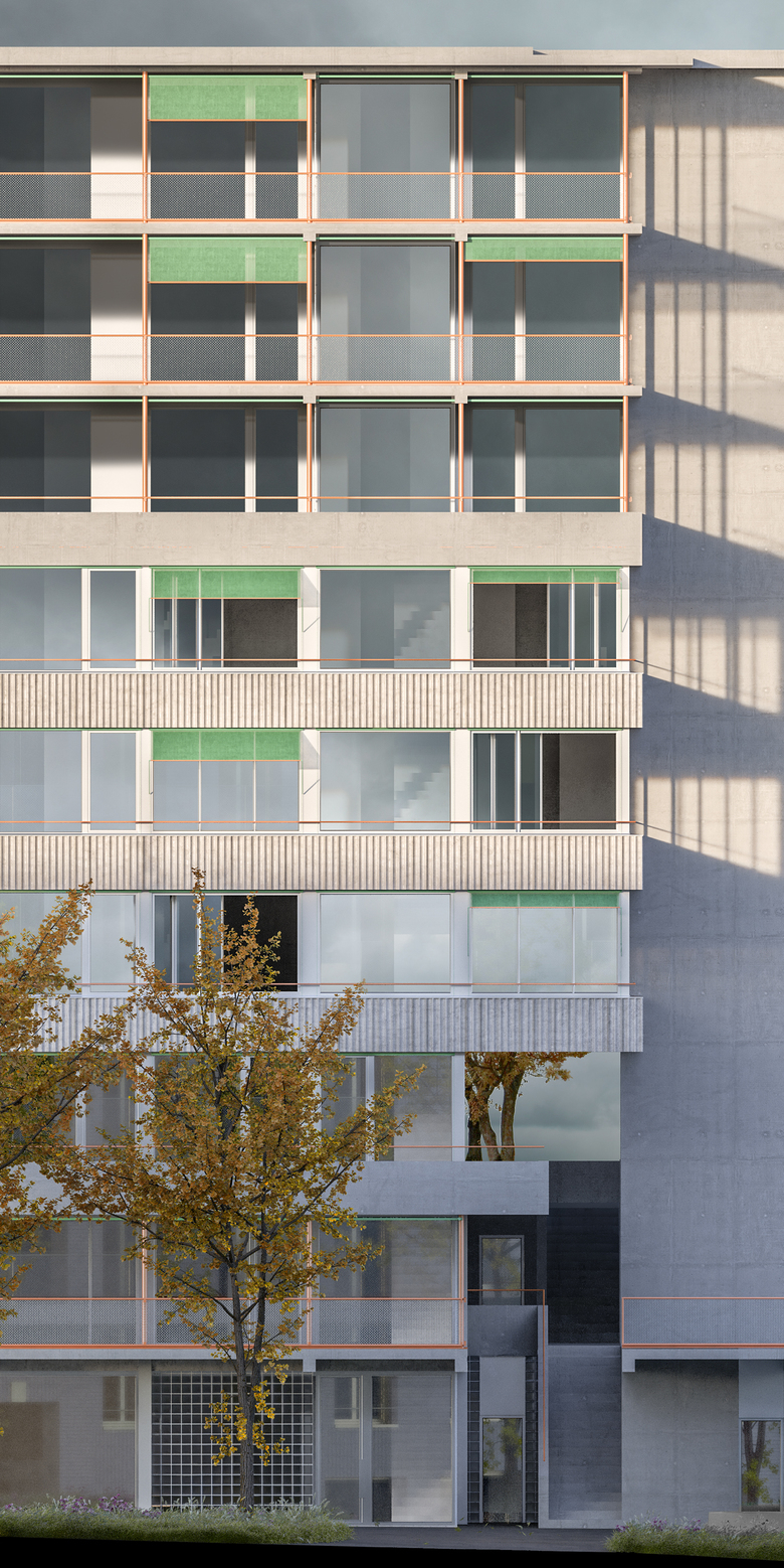 Der einfache Baukörper folgt der städtebaulichen Idee des bestehenden Gebäudes an der Güterstrasse 8, die horizontale Schichtung wird weitergeführt. Eine feine Zäsur in Form eines Durchgangs und die Staffelung des Gebäudes überführt den mächtigen Baukörper in eine Massstäblichkeit der umliegenden Bauten. Der nach Süden ausgedrehte Kopf trennt das Gebäude auch programmatisch.