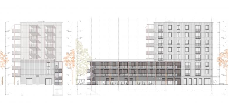 Der achtgeschossige Gebäudeteil an der Pestalozzistrasse markiert den Hauptzugang zur Siedlung, der neu über den Innenhof führt. Wo heute noch Parkplätze sind, entsteht ein neuer Aussenraum für alle. Das Erdgeschoss des Neubaus orientiert sich zum neuen Zugangsweg und zum gemeinsamen Hof. Eine flexible Gewerbefläche befindet sich direkt an der Pestalozzistrasse. Das neue Siedlungs-Bistrot belebt den Hof und kann mit dem angrenzenden Gemeinschaftsraum und der vorgesehenen kleinen Kita kombiniert werden.