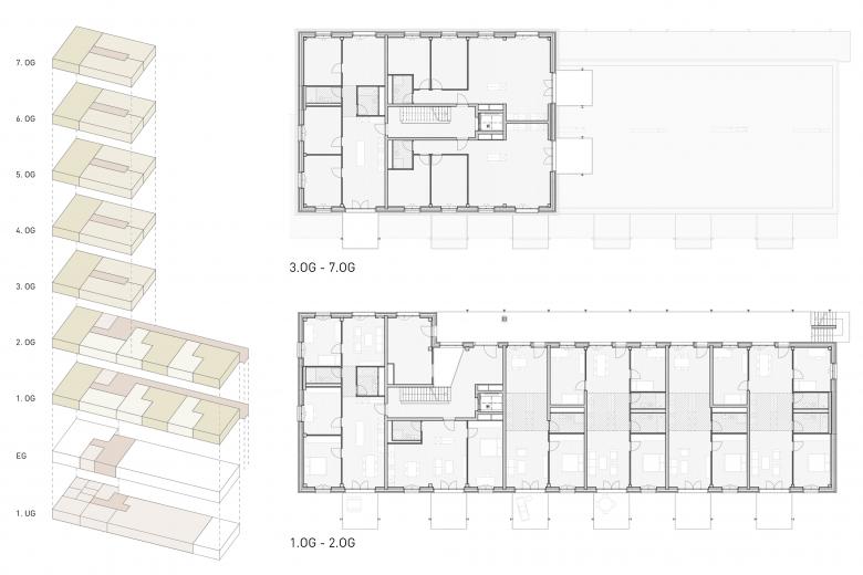 Ein acht- und dreigeschossiger Neubau in Hybridbauweise erweitert die bestehende Genossenschaftssiedlung aus den 1970er-Jahren mit 27 zusätzlichen Wohnungen. Im Erdgeschoss entstehen Gemeinschafts- und Gewerbeflächen und im Hof anstelle des heutigen Parkplatzes vielfältige Aussenräume für alle Bewohner*innen.