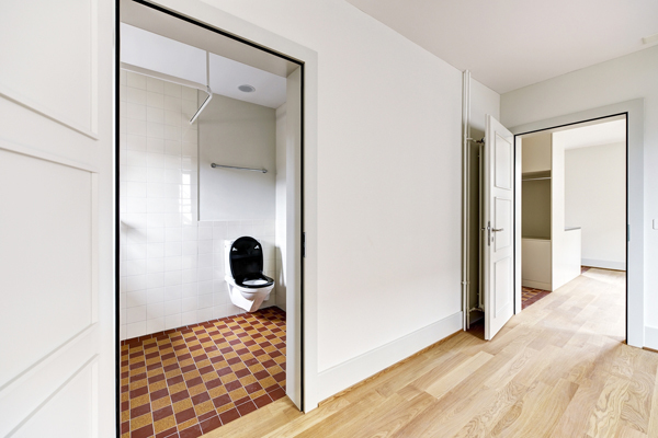 Anders im Dachgeschoss: hier unterstützen offene Grundrisse, überhohe Räume und eine entsprechende Materialisierung die Grosszügigkeit der bestehenden Dachräume. Im überhohen Mittelhaus ist die Dachwohnung gar als Maisonette-Wohnung ausgebildet.