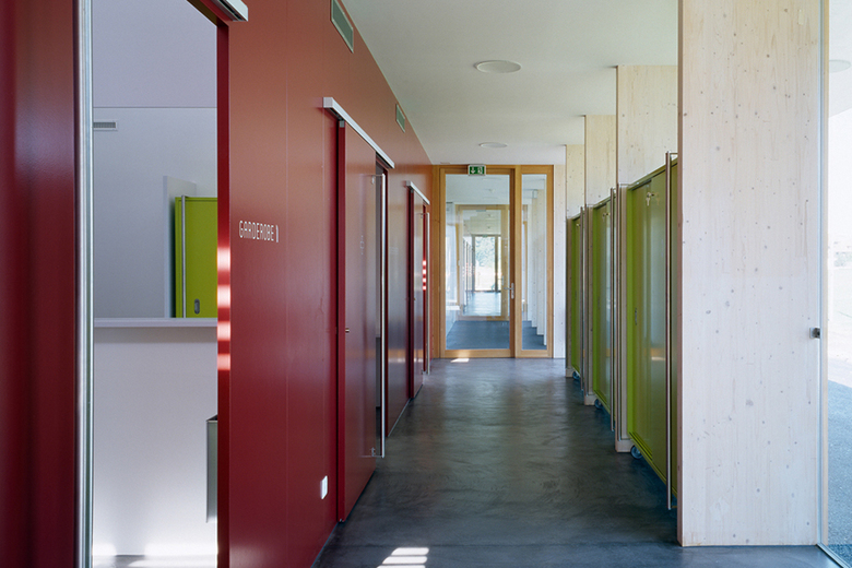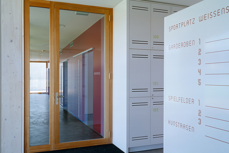 In den durch die Brettschichtholz-Pfosten entstehenden Nischen in der Erschliessungszone werden mobile Garderobenschränke deponiert. Diese werden vor Beginn des Spieles von den Mannschaften in die Garderoben gerollt und mit Kleidern und Taschen aufgefüllt. Danach werden die abschliessbaren Schränke wieder zurück in die Korridorzone verschoben und dort parkiert. Die Garderobenräume sind somit wieder leer geräumt und stehen der nächsten Mannschaft zur Verfügung. Die mobilen Schränke ermöglichen einerseits eine Mehrfachbelegung der Mannschaftsgarderoben, gleichzeitig kann dadurch das Gebäude in der Grundfläche entsprechend kompakt gehalten werden. Das spielerische und dynamische Element beim Gebrauch der Garderobenschränke widerspiegelt sich im Fassadenbild: die parkierten Schränke treten in zufälliger und wechselnder Position in Erscheinung, wodurch sich die Fassade stetig verändert. Die grafische Nummerierung der Garderobenschränke erinnert an die Nummerierung von Fussballtrikots und ermöglicht dem Benutzer, «seinen» Garderobenschrank nach dem Spiel leicht wieder zu finden.