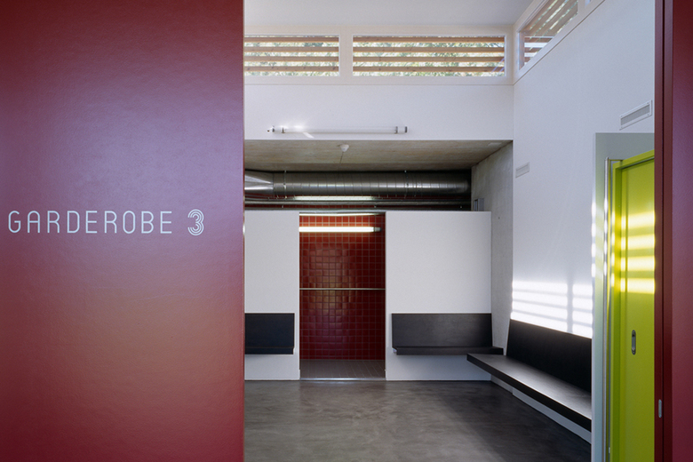 Das Garderobengebäude ist als eingeschossiger, lang gezogener Bau konzipiert und orientiert sich klar zu den Spielfeldern hin. Gebäude und Umgebungswände sorgen für eine grosszügige Tor- und Zugangssituation. Von den Besucherparkplätzen, dem eigentlichen Vorplatz, gelangt man über eine breite Treppe oder eine behindertengerechte Rampe auf das Niveau der Spielfelder. Der Niveauunterschied zwischen Sportareal und Vorplatz wird vom Garderobengebäude gekonnt aufgenommen: das Gebäudevolumen tritt vom Vorplatz her vorerst nur als eine 1.20 m hohe Betonbrüstung in Erscheinung. Dadurch wird bereits bei der Ankunft der Blick auf die tiefer liegenden Sportfelder frei gegeben. Die drei ins Terrain eingelassenen und in Sichtbeton ausgeführten Aussenwände sind Stützwand und Fassade zugleich. Sie bilden eine massive, U-förmige Betonfigur, welche sich gegen die Sportfelder öffnet. In deren Rücken befinden sich die Nassräume und die Haustechnik. Ein aus vorfabrizierten Elementen gefertigter Holzbau wird in die massive Betonfigur gestellt. Das Gebäude wird über eine Lüftungsanlage beheizt und belüftet und erfüllt den Minergie-Standard.
