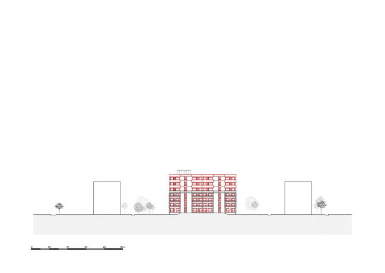 Im Grundsatz folgen die neuen Aufbauten den Vor- und Rücksprüngen des Bestandes. Im Sinne des Weiterbauens wird die Zäsur zwischen den bestehenden Bauten und den neuen Aufbauten dargestellt. Der neue Dachabschluss führt das vorgefundene Thema weiter und orientiert sich dabei an den Gliederungsgrundsätzen des Bestandes. Das Prinzip der Öffnungen wird bei den Aufbauten übernommen, sie orientieren sich an den Regeln und Proportionen des Vorgefundenen.