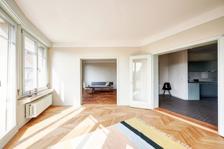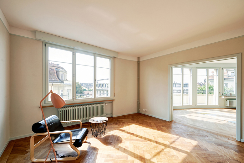 Die Arbeit am prominenten Blockrandbau an der Ecke Mittelstrasse-Länggassstrasse ist eine architektonische Spurensuche zurück in die 1930er-Jahre. Mit viel Sorgfalt und Akribie wird der ursprüngliche Geist des Hauses anhand gestalterischer Details erforscht und mit handwerklichem Geschick wiederbelebt.