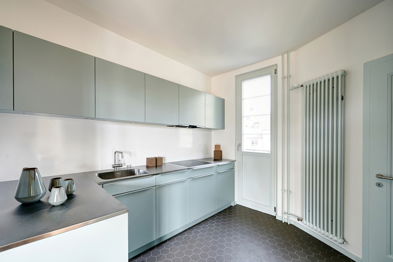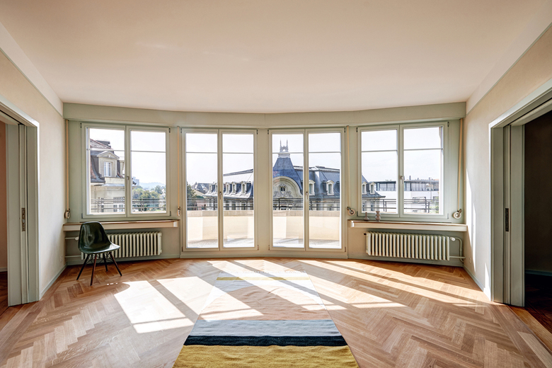 Sorgfältig wurden die Oberflächen auf ihre ursprüngliche Materialität und Farbigkeit untersucht. Wo immer möglich wurden die originalen Bauteile restauriert und weiterverwendet. Kleine Details zeichnen den Umgang im Bestand aus – so wurde zum Beispiel die in der Schaufensterfront integrierte Ausstellstore im Gewerberaum repariert, fehlende Teile nachgebaut und der Antrieb wieder gangbar gemacht. Die wiedergewonnene Farbigkeit im Treppenhaus und in den Wohnungen, die feine farbliche Zäsur in den Wohnräumen, sowie die Wahl der keramischen Oberflächen folgen dem entwickelten Sanierungskonzept. Hofseitig erhalten die Wohnungen grössere Balkone, welche den Ausdruck des Gebäudes aufnehmen. Das Attikageschoss erfährt eine grundlegende Erneuerung. Das architektonische Konzept verfolgt eine klare Trennung zu den Regelgeschossen und bildet den neu gewonnenen Wohnraum formal als Neubau ab.