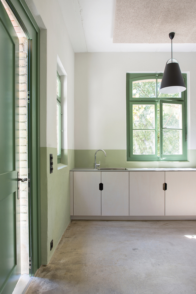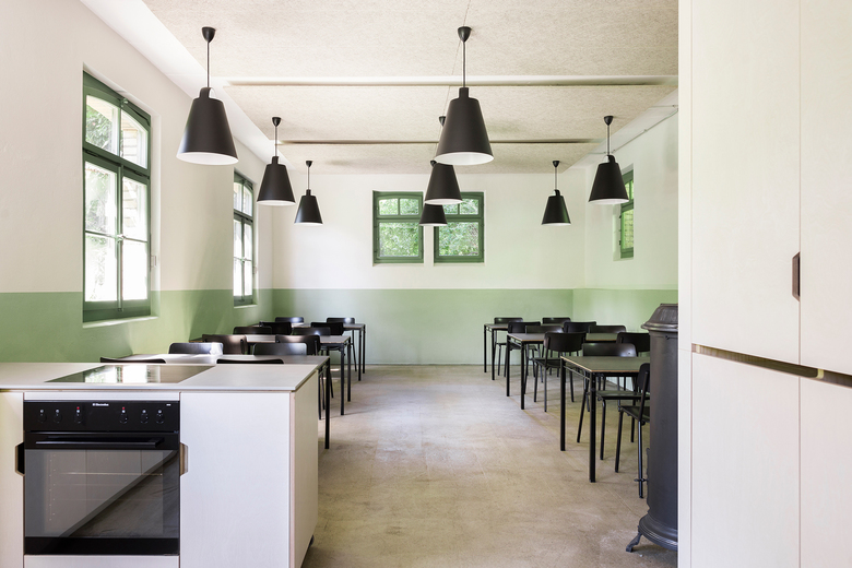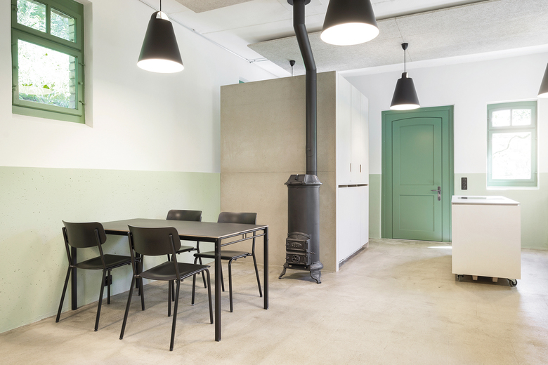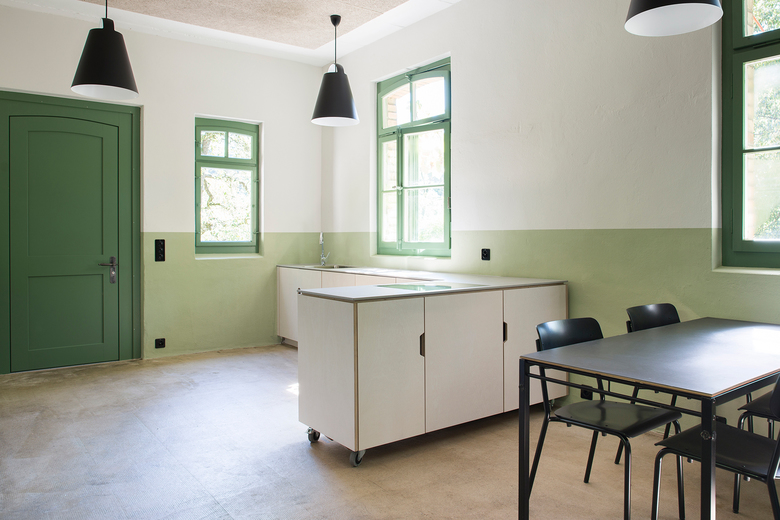 Die Untersuchung der bestehenden Fenster und der Eingangstüre brachte einen kräftigen Grünton als ursprüngliche Farbe ans Licht. Dieser Farbton prägt zusammen mit dem farblich angepassten Sockel im Innern das neue Raumgefühl. Bewusst verzichten wir auf schulungsraumtypische Elemente im Ausbau. Sowohl die eigenständige, dimmbare Beleuchtung als auch die Möblierung assoziiert man eher mit Bildern eines Ateliers oder einer Werkstatt. Für die Kinder soll der Besuch des Angebots der Gartenpädagogik zu einem speziellen Erlebnis werden.