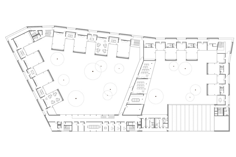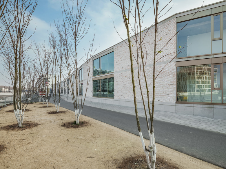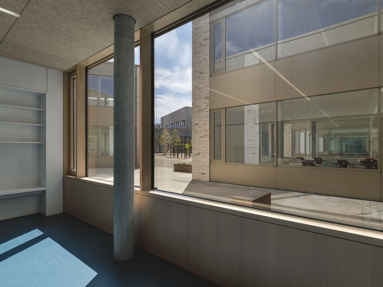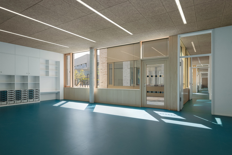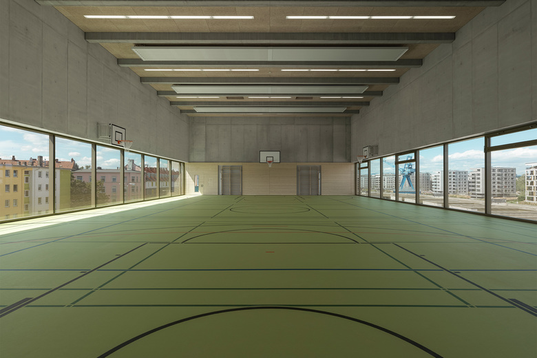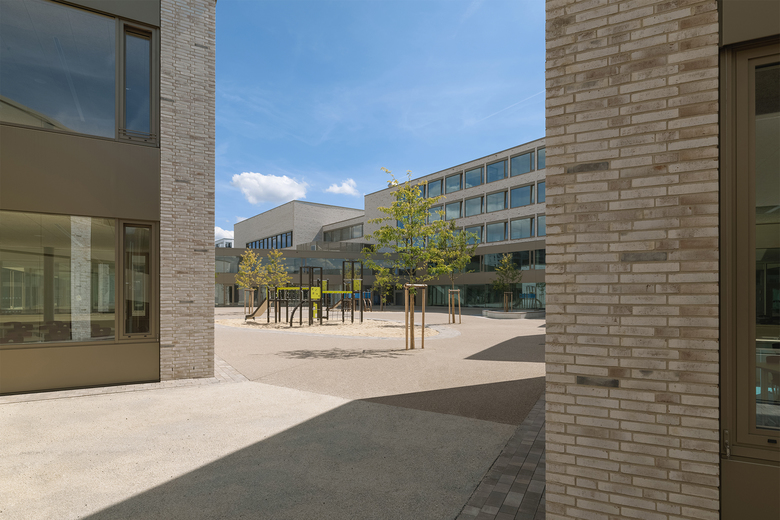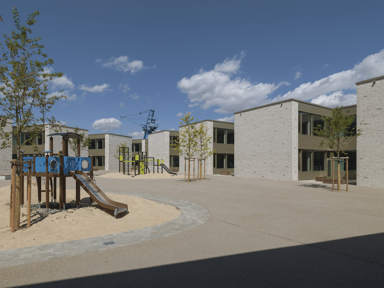 Wie ein Schutzgürtel umschließen Grundschule, Kindergarten und Sporthalle einen großen Hof, der als grüne Mitte das Herz der beiden Einrichtungen bildet und als Spiel- und Lernbereich genutzt wird. Der 5-geschossige Fachklassentrakt und die übereinander angeordneten Sporthallen bilden eine kraftvolle Raumkante zum Nordring. Zum Innenhof entsteht aus den wechselnden Nutzungsbereichen eine feingliedrige Struktur mit einzelnen, sehr gut ablesbaren Klassenhäusern. Die Räume der Krippe sind ebenerdig zum Innenhof im Erdgeschoss, die Räume des Kindergartens im 1. Obergeschoss angeordnet.