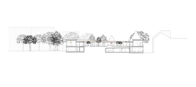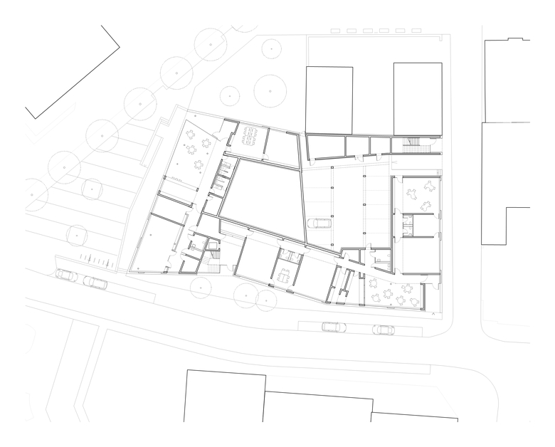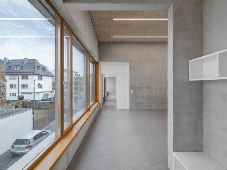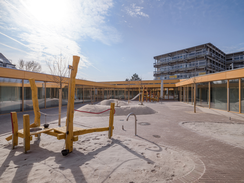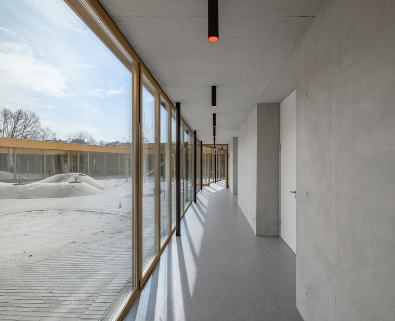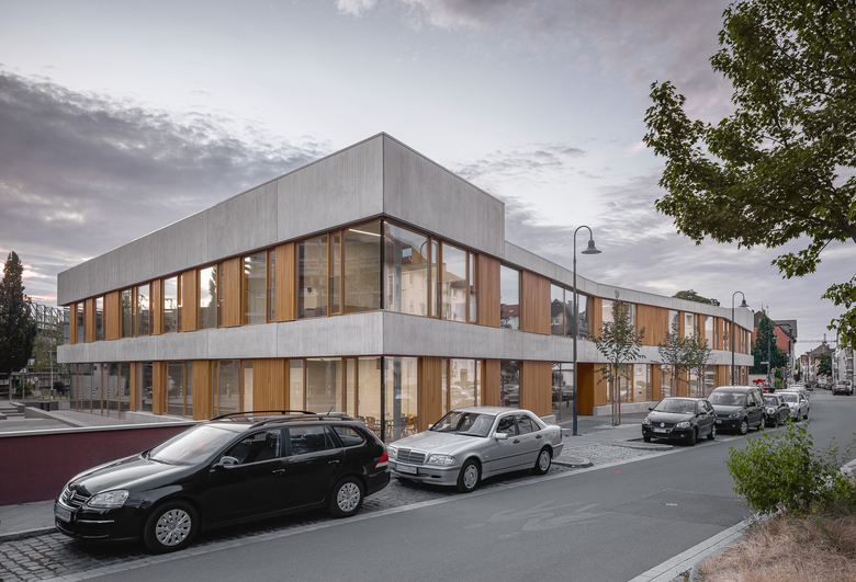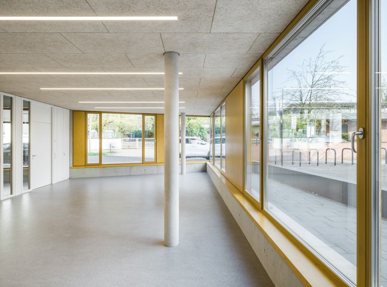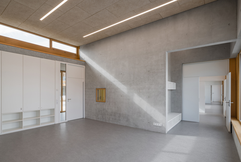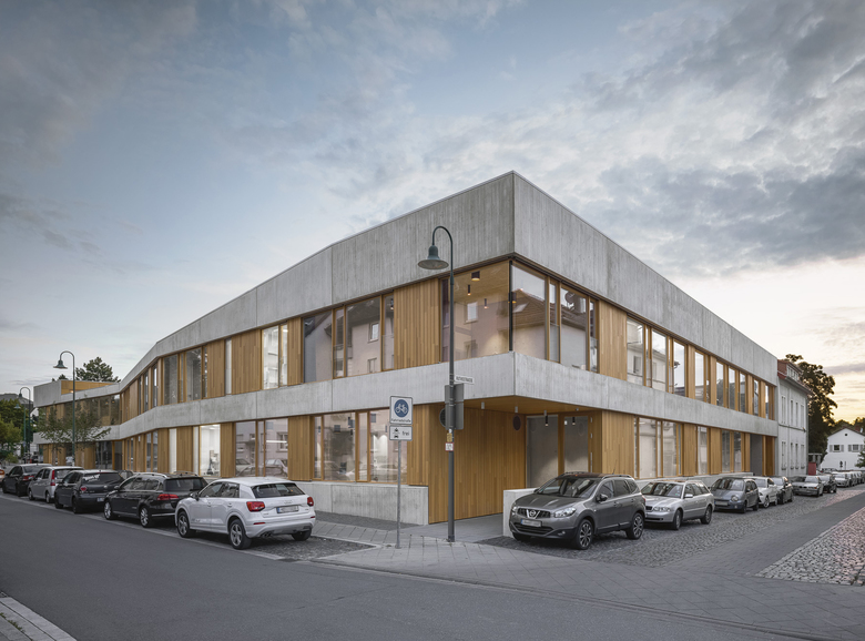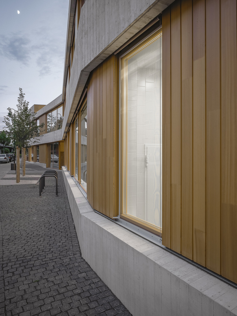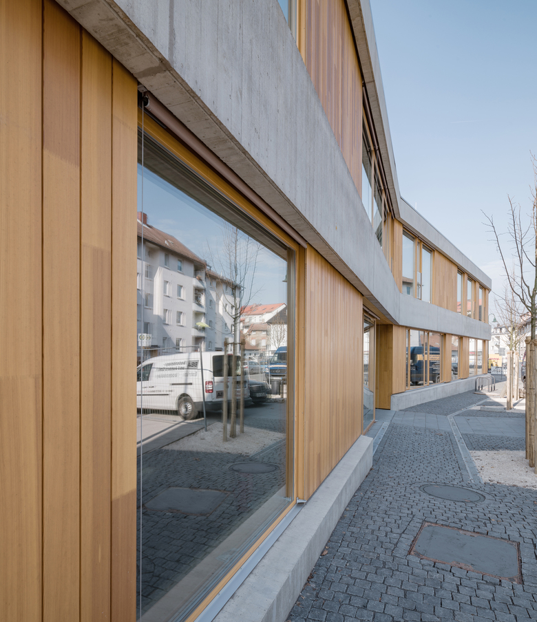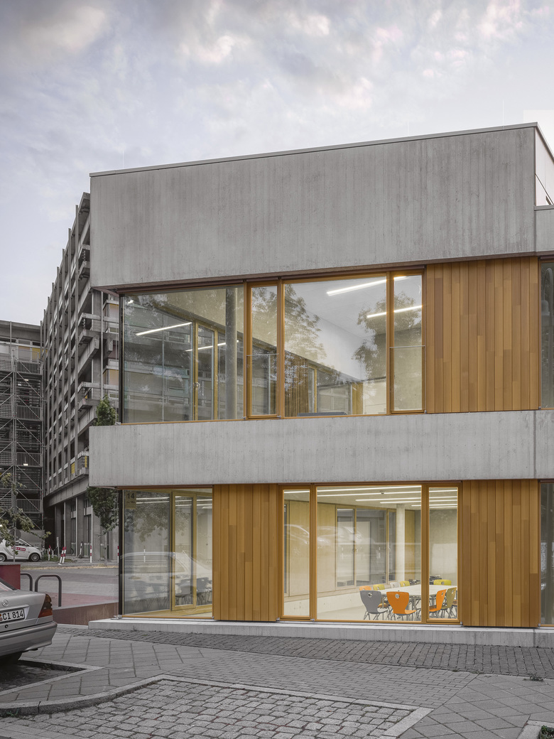 Mitten im Quartier ist das von allen Seiten gut erreichbare Grundstück für die Nutzung als Betreuungseinrichtung ideal gelegen. Der zweigeschossige Baukörper löst mit einer zunächst ungewöhnlichen Funktionsverteilung – Kindertagesstätte im Obergeschoss, Jugendzentrum und Schülerbetreuung im Erdgeschoss – die Anforderungen an Erschließung und Niedrigschwelligkeit. Durch die zurückhaltende Architektursprache fügt sich der Baukörper sehr gut in den heterogenen Kontext ein. Im Inneren wird eine bergende, heitere und freundliche Atmosphäre der Offenheit erzielt als Voraussetzung für entspanntes Heranwachsen und Lernen.