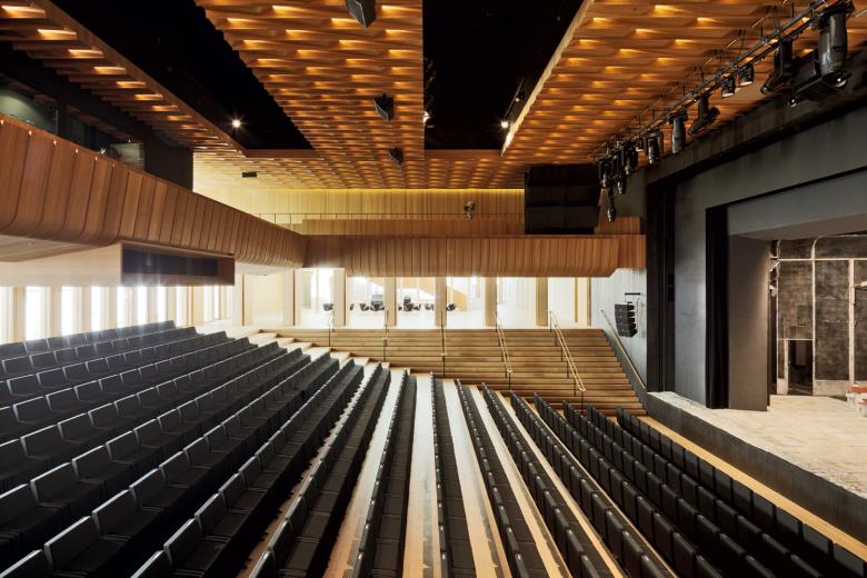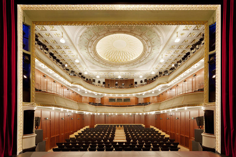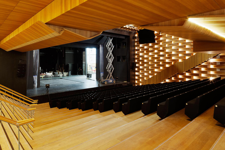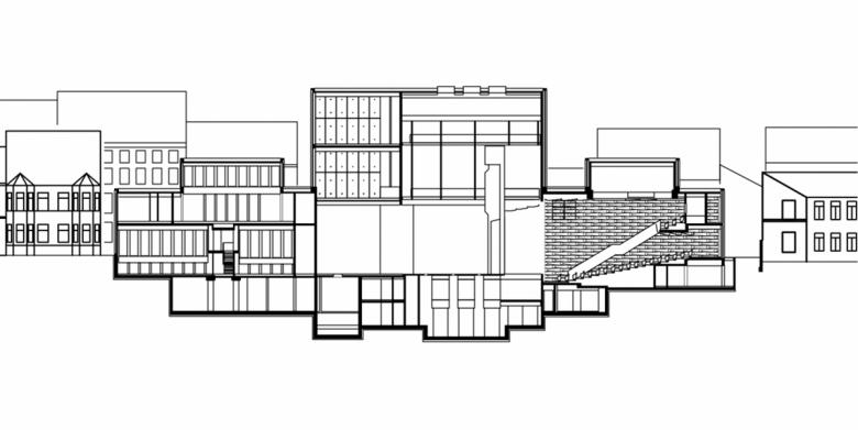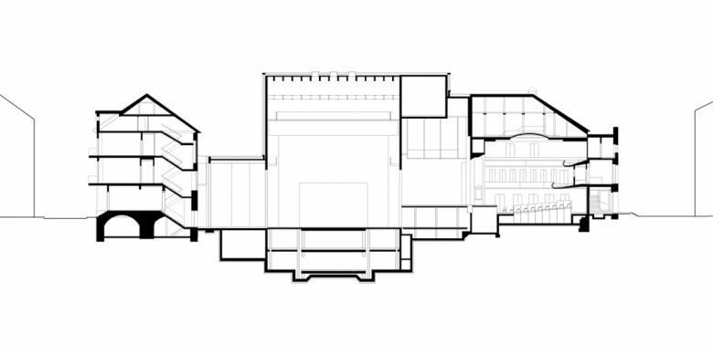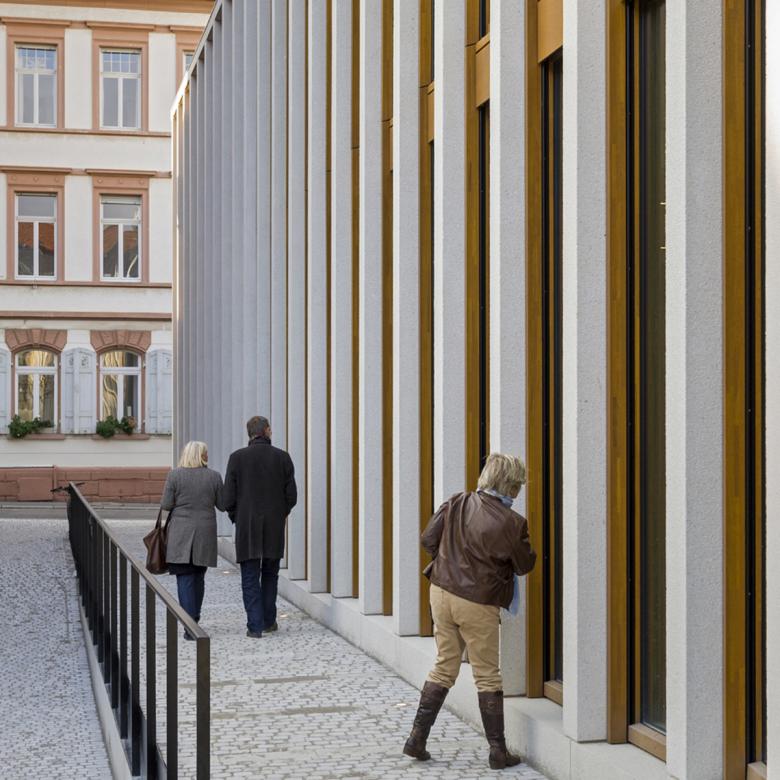 Die große Kubatur der Theaterfunktionen verbirgt sich unter einer durchgehenden nur zweigeschossigen Dachplatte. Diese fährt allseitig die Grundstückskanten nach und verbindet so die heterogene Gebäudesubstanz des historischen Bestands. Die aufragenden Kuben der Proberäume und des Bühnenturms bilden maßstäbliche Hochpunkte und Gliederungen innerhalb der Dachlandschaft der Altstadt. Die senkrechte, feingliedrige Fassadenstruktur aus hell eingefärbten Sichtbeton-Fertigteilstützen nimmt vorhandene Proportionen auf und gibt den Altbauten ein zurückhaltendes, ruhiges Passepartout, so dass diese in ihrer Wirkung gesteigert werden. Aus der Kombination der alten und neuen Bühnenbereiche ergibt sich eine untypische Seitenerschließung des neuen Theatersaals, aus der ein neuartiges Raumkonzept mit vielfacher Bespielbarkeit entwickelt wird.