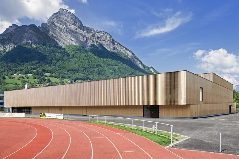 Die neue regionale Sportanlage Sargans ist ein ein- bzw. zweigeschossiger Holzbau als Skelettbau auf einer Stahlbetonbodenplatte und Rammpfahlfundation für eine 4-fach Turnhalle. Das Haupttragwerk bilden stabförmige Brettschichtträger, während das Nebentragwerk aus flächigen Holzplatten hoher Festigkeit gebildet wird.