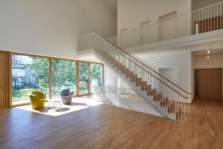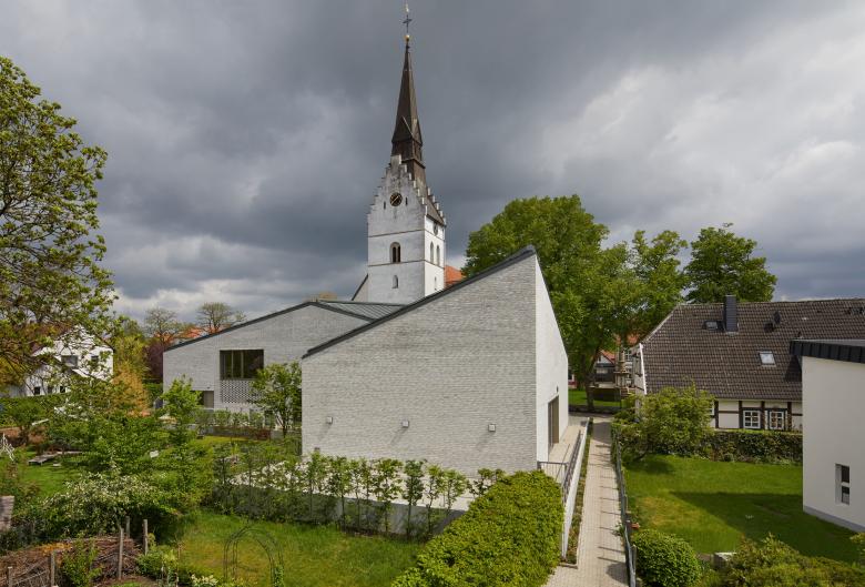 Das Wettbewerbsgrundstück befindet sich in einem sensiblen innerstädtischen Umfeld der Versmolder Innenstadt, welches insbesondere durch die Petri-Kirche, den Kirchplatz und das denkmalgeschützte Kantorhaus geprägt ist. Vor diesem Hintergrund schlägt der Entwurf für das neue Gemeindehaus einen Baukörper vor, der, die Körnung der unmittelbaren Umgebung aufnehmend, sich maßstäblich in den Ort einfügt, ohne dabei seine Zeitgenossenschaft zu verstecken. Diese wird maßgeblich durch eine gefaltete Dachlandschaft bestimmt, welche den Neubau überspannt.