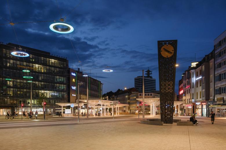 Der Entwurf für die Umgestaltung des Jahnplatzes sieht unter anderem die Erneuerung der Haltestellenüberdachungen wie auch die Einrichtung eines Fahrradparkhauses im jetzigen Jahnplatz-Forum vor. Anders als die bestehenden großflächigen Dächer werden für die neuen Überdachungen Gruppen von einzelnen schirmartigen Konstruktionen vorgeschlagen, deren Zahl je nach Größe der zu überdachenden Haltestellenbereiche variiert. Auch in ihrer Größe und Höhe sind die Dächer unterschiedlich, so dass sich für jeden einzelnen Haltestellenbereich ein aufgelockertes lebendiges Erscheinungsbild ergibt.