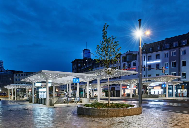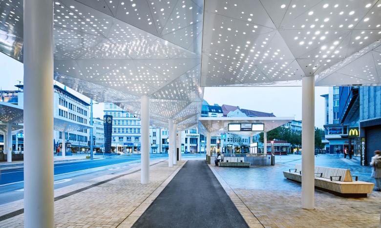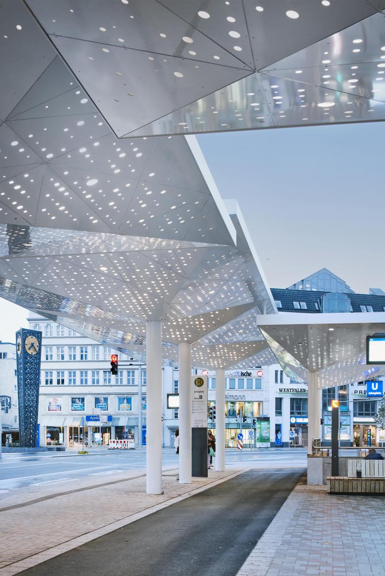 Von unten werden die Dachkonstruktionen mit einem transluzenten Netzgittergewebe bespannt. Zu seiner Befestigung werden Pfetten in einem Abstand von circa einem Meter quer zu den Dreiecksträgern vorgesehen, auf denen die Spannvorrichtungen angebracht werden. Auf der Oberseite bilden auf den Dreiecksträgern befestiget Doppelstegplatten aus Polycarbonat eine wasserführende Ebene, über die das auf den Dächern anfallende Regenwasser kontrolliert in ein in der Rundstütze verlaufendes Fallrohr geleitet wird. An seinem unteren Ende wird das Fallrohr aus der Rundstütze herausgeführt und an ein Entwässerungssystem angeschlossen. Innerhalb des durch Polycarbonat-Tafeln und Netzgitterbespannung gebildeten Hohlraums sorgen LED-Leuchten für eine Illuminierung der Dächer wie auch der darunter liegenden Flächen.