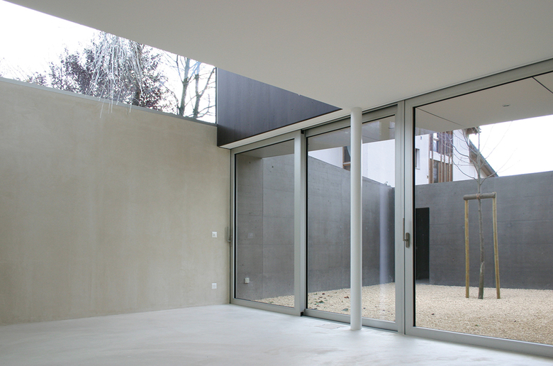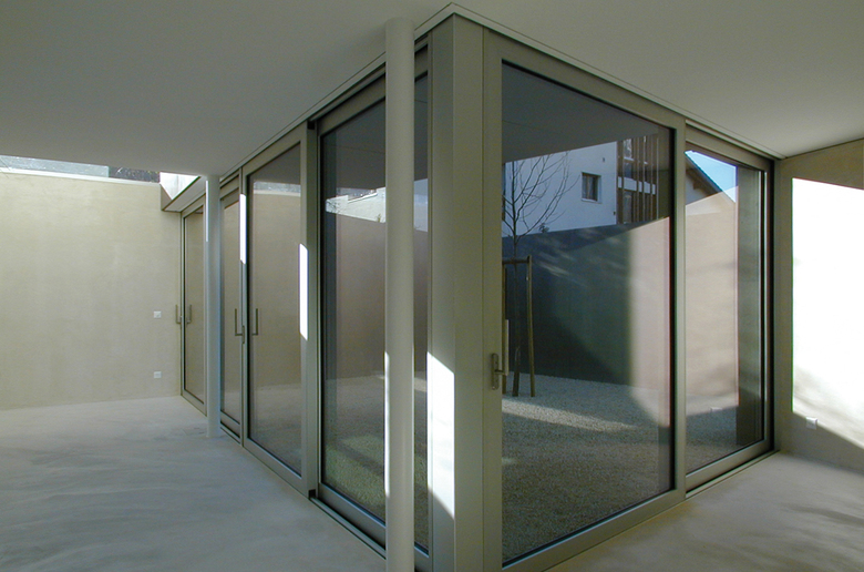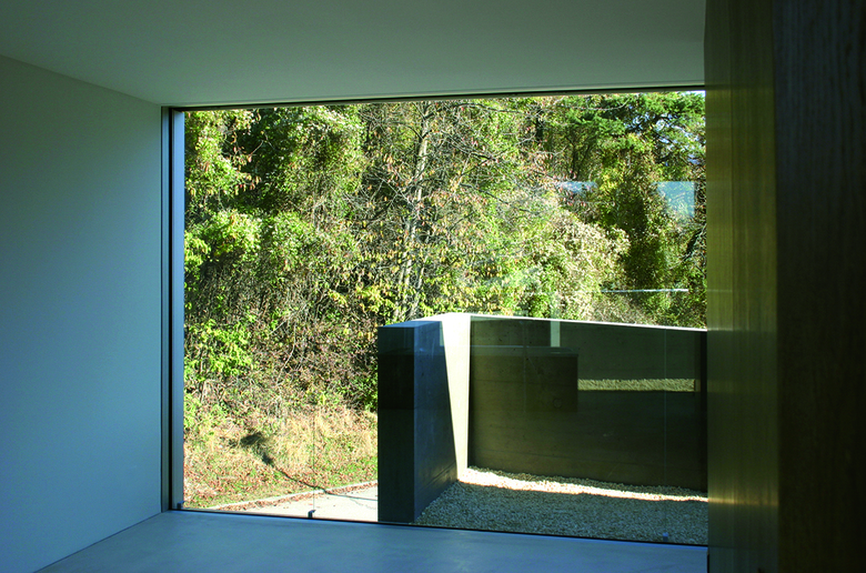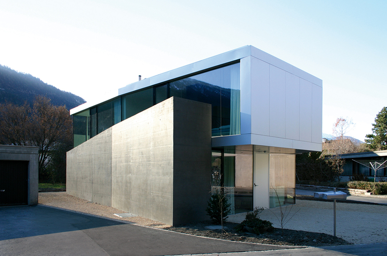 Neben einem eindrücklichen Sichtbetonhaus aus den 1970er Jahren wünschte sich die Bauherrschaft ein kleineres, nicht minder spezielles Haus als «Alterstöckli». Trotz der unmittelbaren Nachbarschaft sollte das neue Gebäude dem alten Haus nicht zu nahe treten, um dessen unbestrittene Qualitäten nicht zu mindern und die nötige Abgrenzung zu wahren. Der Neubau wird aus diesen spezifischen Besonderheiten des Ortes sowie aus der Form der Restparzelle entwickelt: Eine Schale aus eingefärbtem Sichtbeton bildet einerseits ein introvertiertes, privates Erdgeschoss mit einem Atrium ähnlichen Aussenraum und andererseits eine räumliche Grenze zum verkauften Grundstücksteil. Die Betonschale verläuft mehrfach abgewinkelt und umfasst nahezu die gesamte neue Parzelle. Die Eingangsfront an der Nordseite ist ohne «Schutzmauer», hier empfängt ein verglastes Entree die Besucher mit Offenheit. Aus der Betonschale heraus ragt das grossflächig verglaste Obergeschoss, mit herrlicher Weitsicht beidseitig ins Tal. Die Materialisierung im Inneren folgt der Logik des Grundkonzeptes des Hauses. Die Decken sowie die tragenden Betonwände sind weiss gestrichen. Die Vorsatzschalen, d. h. die Bereiche der Innenisolation, thematisieren jedoch das Auskleiden: Der Gips wird roh belassen und bildet mit dem Anhydritboden, welcher durch das schwimmende Einbringen ebenfalls als Auskleiden interpretiert wird, eine Einheit. Zusammen mit den Materialien des Innenausbaus und der Möblierung ergibt sich ein stimmiges Farbkonzept, welches präzis dem Fügen der verschieden Bauteile entspricht, aber auch auf der vorhandenen Möblierung der Bauherrschaft aufbaut.